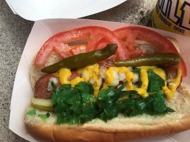 I, of course, had to have a Chicago style hot dog. The hot dog is just your normal hot dog. In fact, the one I got down by the bean was not as good as a Hebrew National. BUT the toppings did make it exceptionally good. It had fluorescent green relish (I wonder why it is so green?), hot peppers, sliced tomatoes, and a pickle spear –Yum!