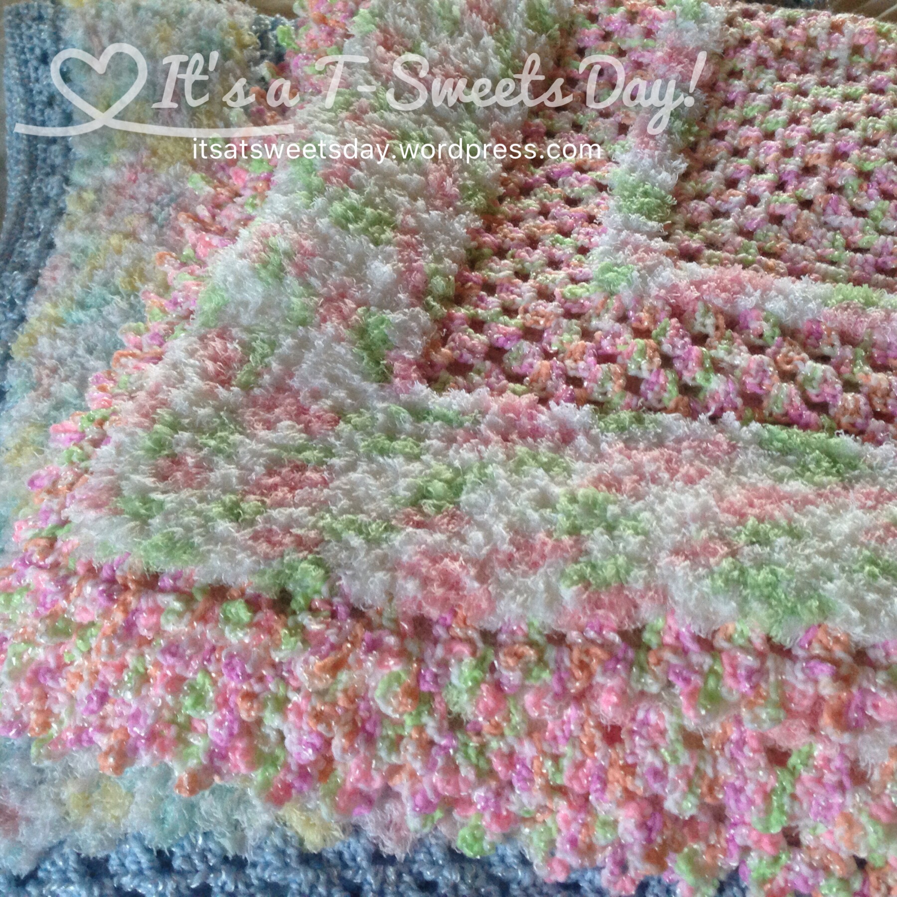 I added the fantastic Pipsqueak fuzzy yarn in random rounds working in double crochet in every other stitch.  For the borders I added a plain double crochet edge for the blue blanket and a fancy lace border that I designed for the pink blanket.