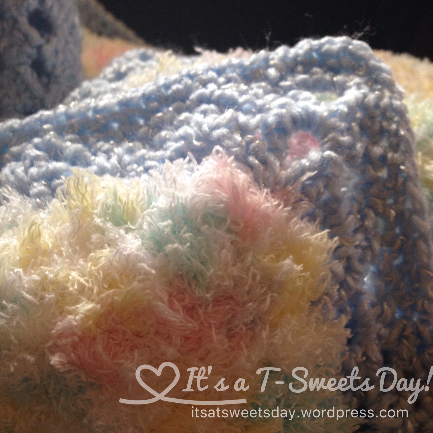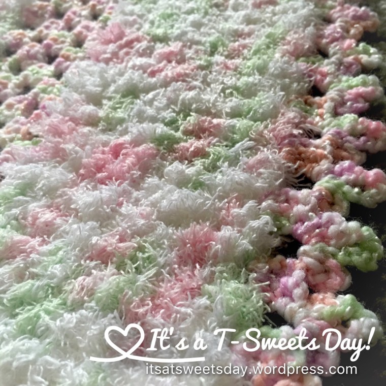 I was so excited that I couldn’t wait for a confirmed sonogram picture telling us the gender.  I just plunged right into sewing and made a blue and a pink afghan so I could be ready for either one.  I used Bernat baby yarn with matching Bernat Pipsqueak baby print fuzzy yarn.