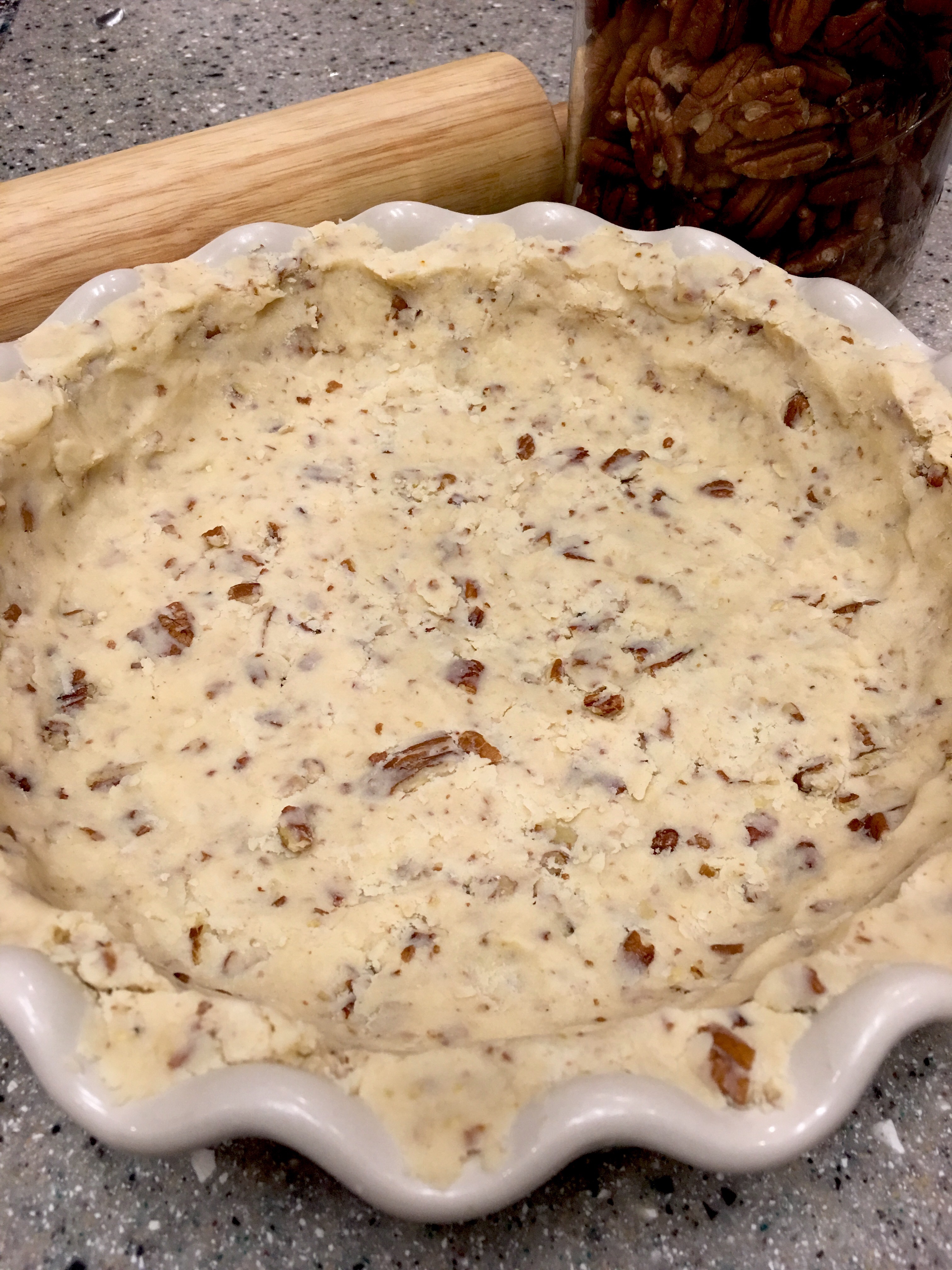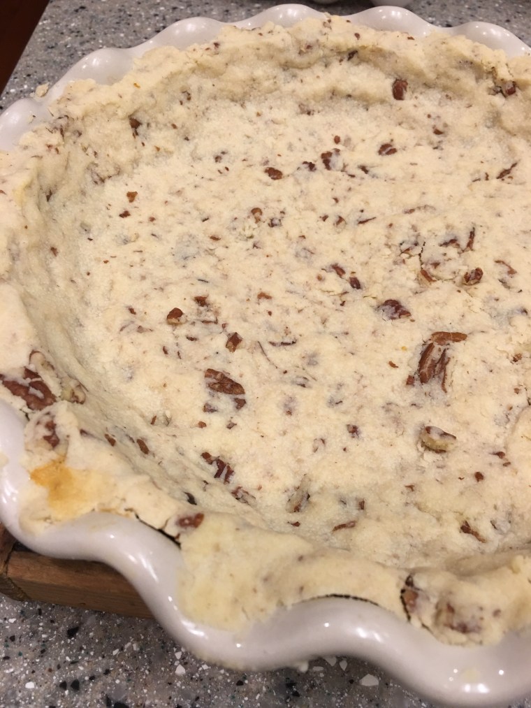 Directions:   For crust, combine all ingredients in a bowl and mix until crumbly.  Press into a large pie pan.  Bake at 350* for 15-20min or until dry to the touch and lightly golden.