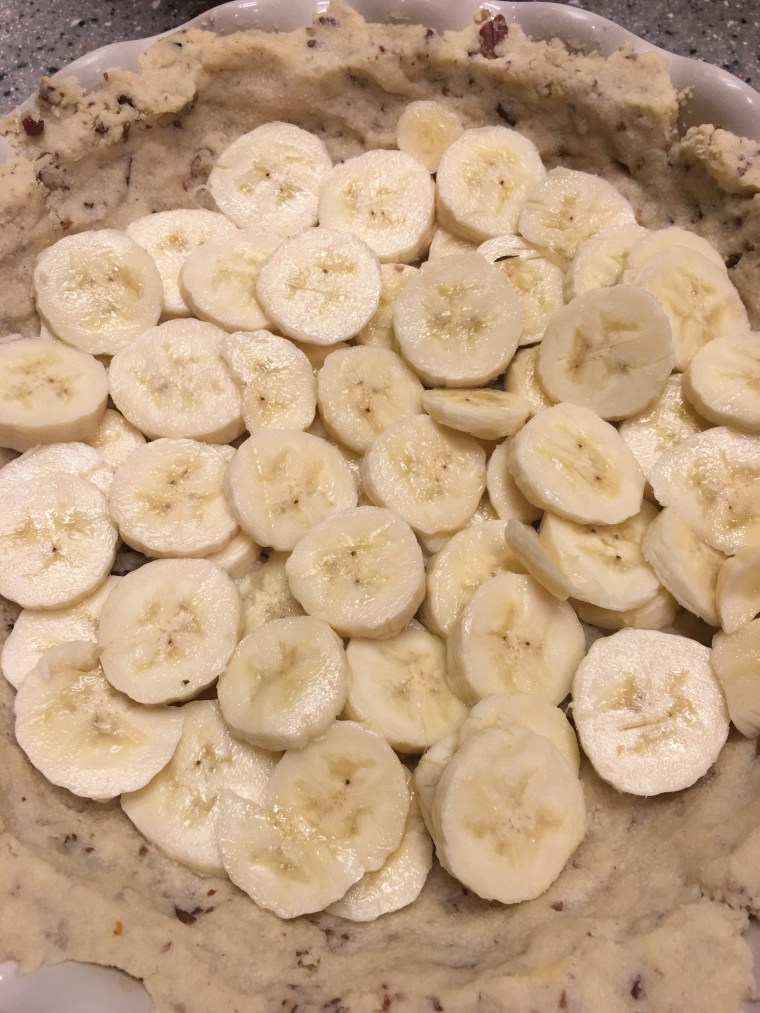 Make cream filling–  In a small bowl add sugar cornstarch, and eggs to 1/4c of milk.  Stir to combine.  In a med saucepan, stirring constantly, heat the 2cups of milk with the butter.  When the butter is melted, stir in the egg mixture. Keep stirring until it thickens like a soft pudding.  Take off the heat and add vanilla.  Keep stirring until smooth.  Slice bananas evenly in pie crust.  Pour cream over the bananas into the crust.  Cover with plastic wrap and cool.