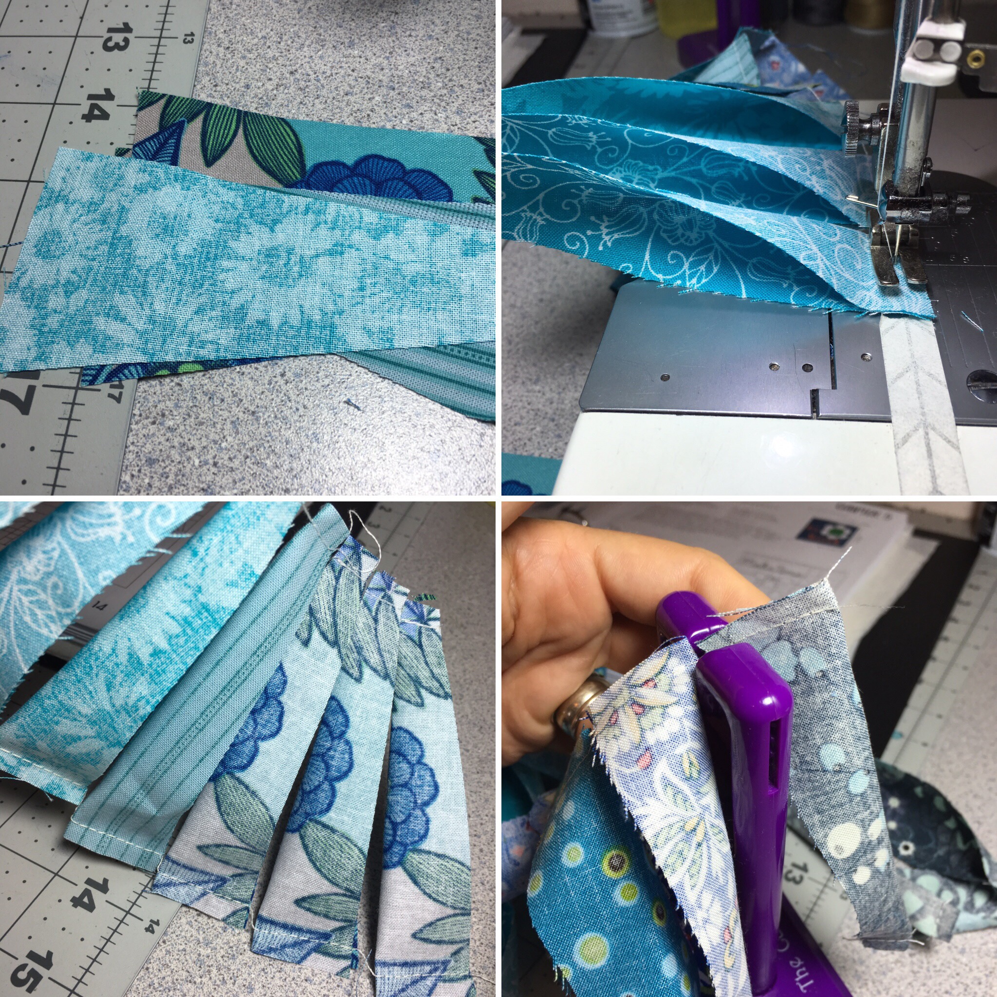 Cutting the fabric the right shape, folding and then chain sewing really makes the petals sew up quickly. Using the cutting gizmo just makes cutting that chain a breeze:)