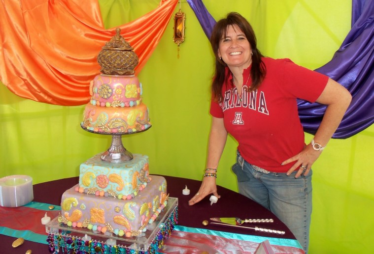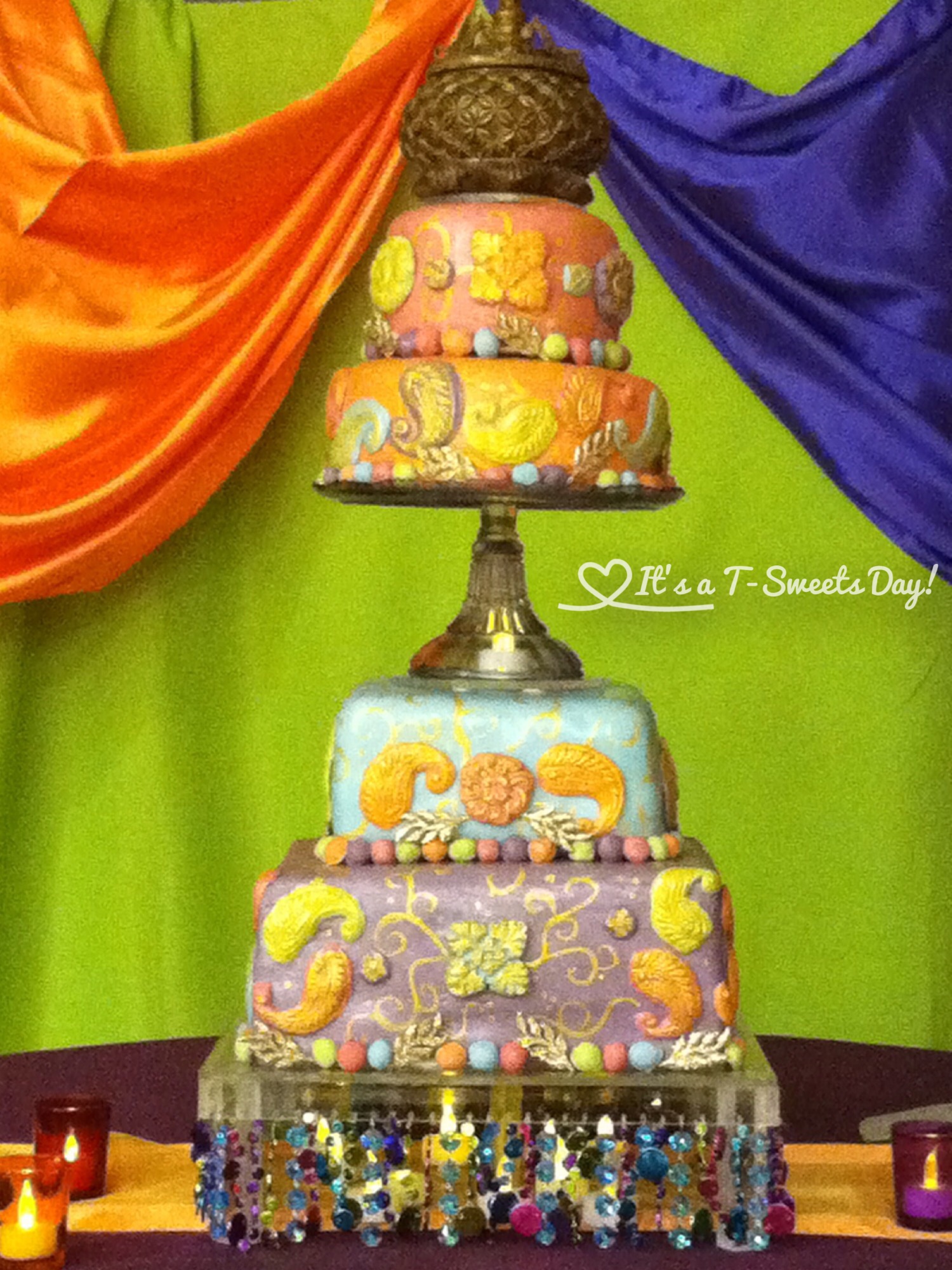 I hand painted the fondant and pressed and painted the paisley decorations. My husband made the colorful stand. There were tea lights under the stand and under the middle stand as well.