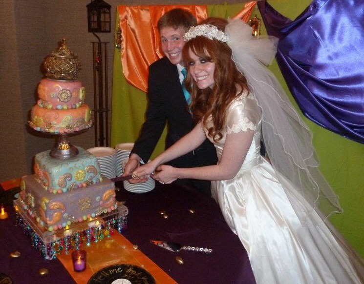 Her wedding was a colorful event filled with the bold bright colors of the color wheel. Her cake was a four layered Moroccan styled cake with layers of red velvet with a cheese cake layer, chocolate with chocolate ganache, and lemon for the groom.