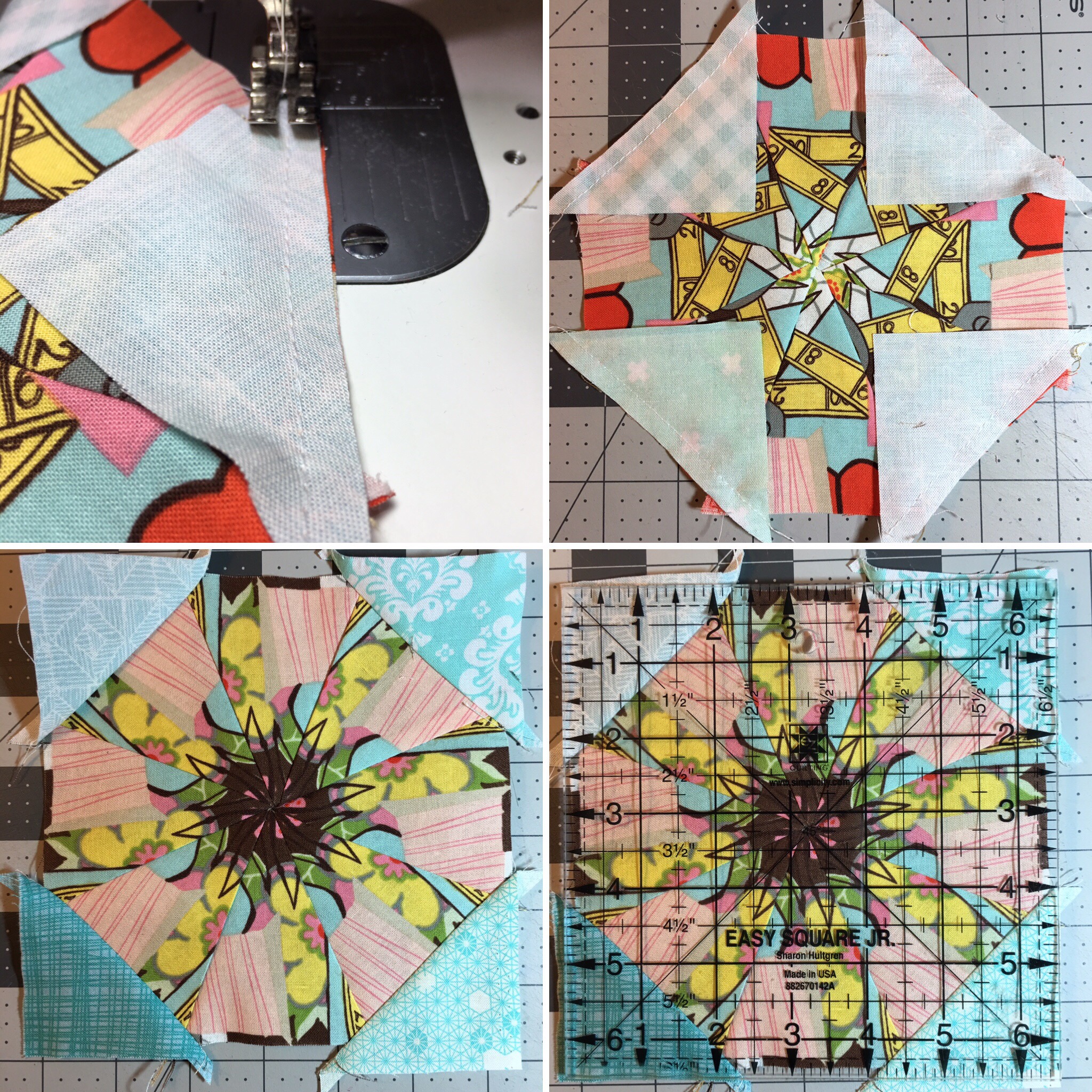 I quickly put aside everything else and decided that they had waited long enough and today was the day that they were going to again meet the sewing machine.  I added the corner triangles to make them square. And then trimmed the block to a a neat square:)