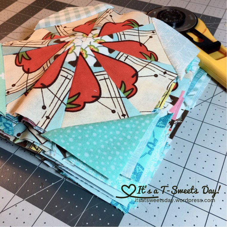 I then gathered up my teals, reds, and yellows and started cutting strips and stacking them into piles to make log cabin blocks.