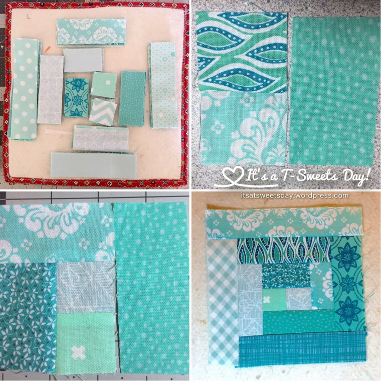 For any of you who have never made a log cabin block, it is really very very easy.  You cut the strips or “logs” and then, starting with the center squares, sew them together in a clockwise direction making the block bigger one log at a time.