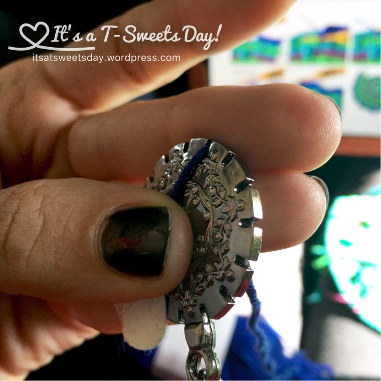 I was very pleased with my new thread cutter fob. I bought it on amazon and put it on a long silver chain. I wore it as a pretty necklace and walked right through the airport screening with no problems at all. I loved that when I needed to clip my threads, this handy cutter was right there, waiting around my neck. It was great! (Isn’t it funny that I am holding the fob as if it is the yarn? I’m definitely a crocheter!)