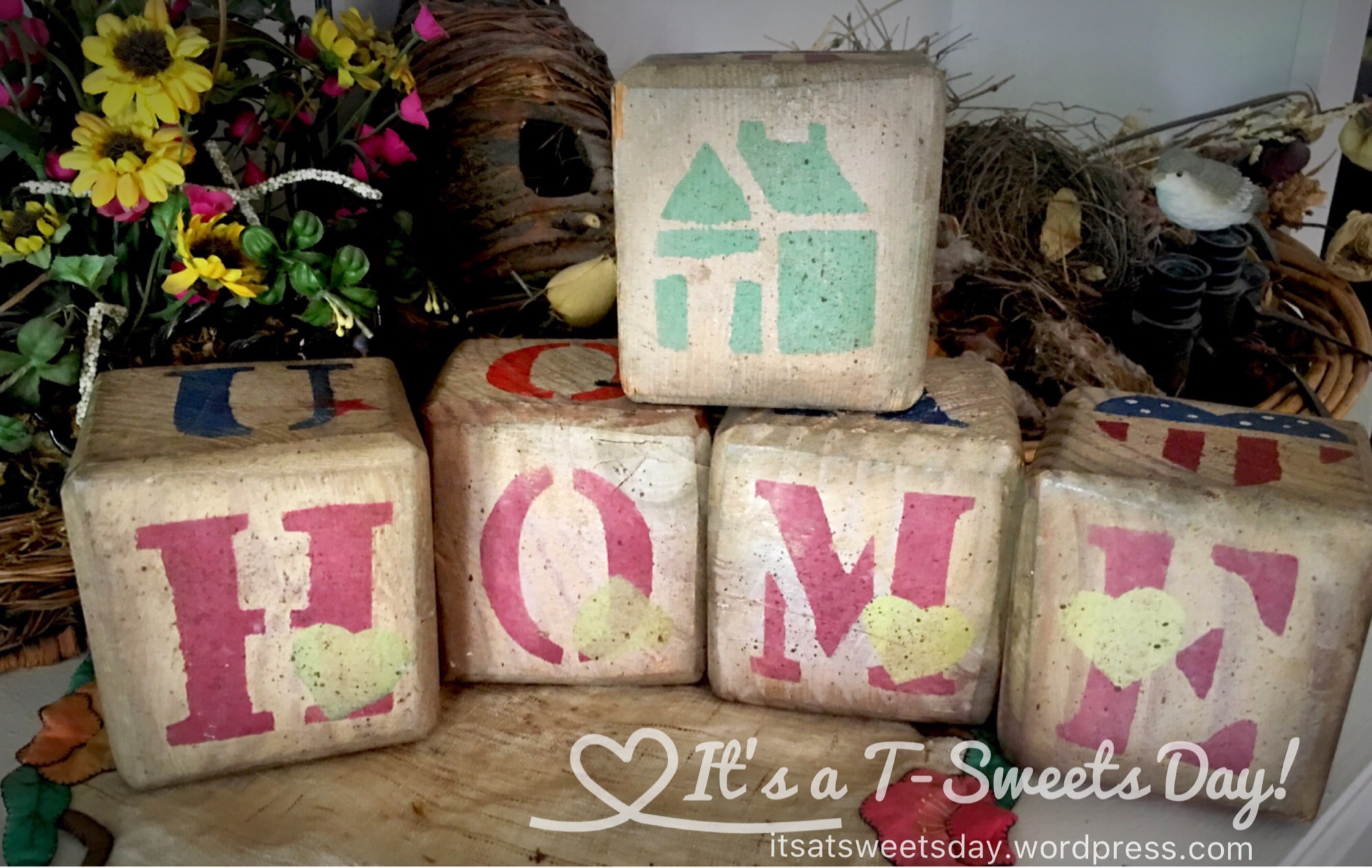 BUT there is one decoration that has lasted through the raising of all of my children. It is a set of 4″x4″ wooden blocks that I made when my oldest was only three years old:). Ahh the memories:)!