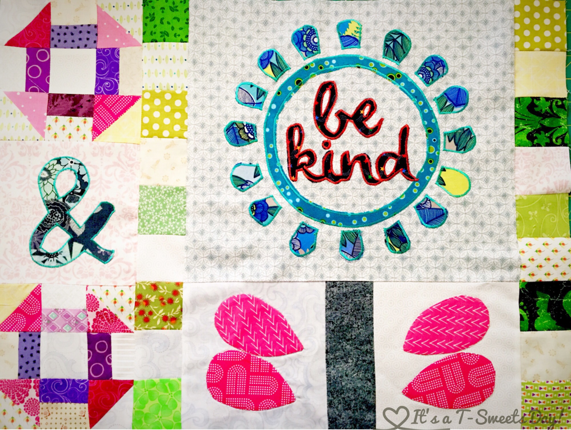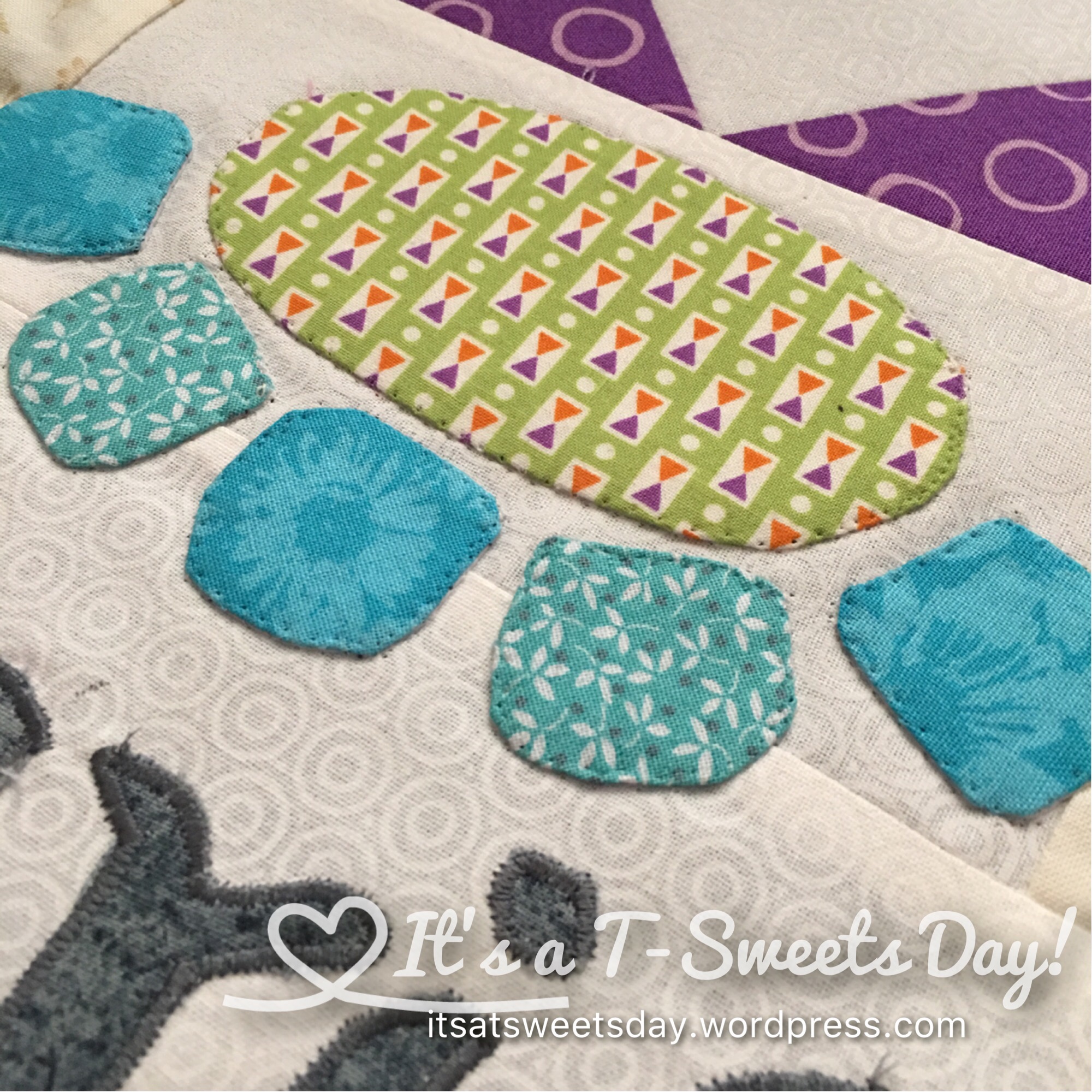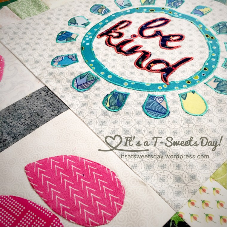 I am not sure if I am crazy about the pink petals. I may trade them out for orange to match the satin stitch around the lettering and to pull some more orange to the bottom of my quilt.