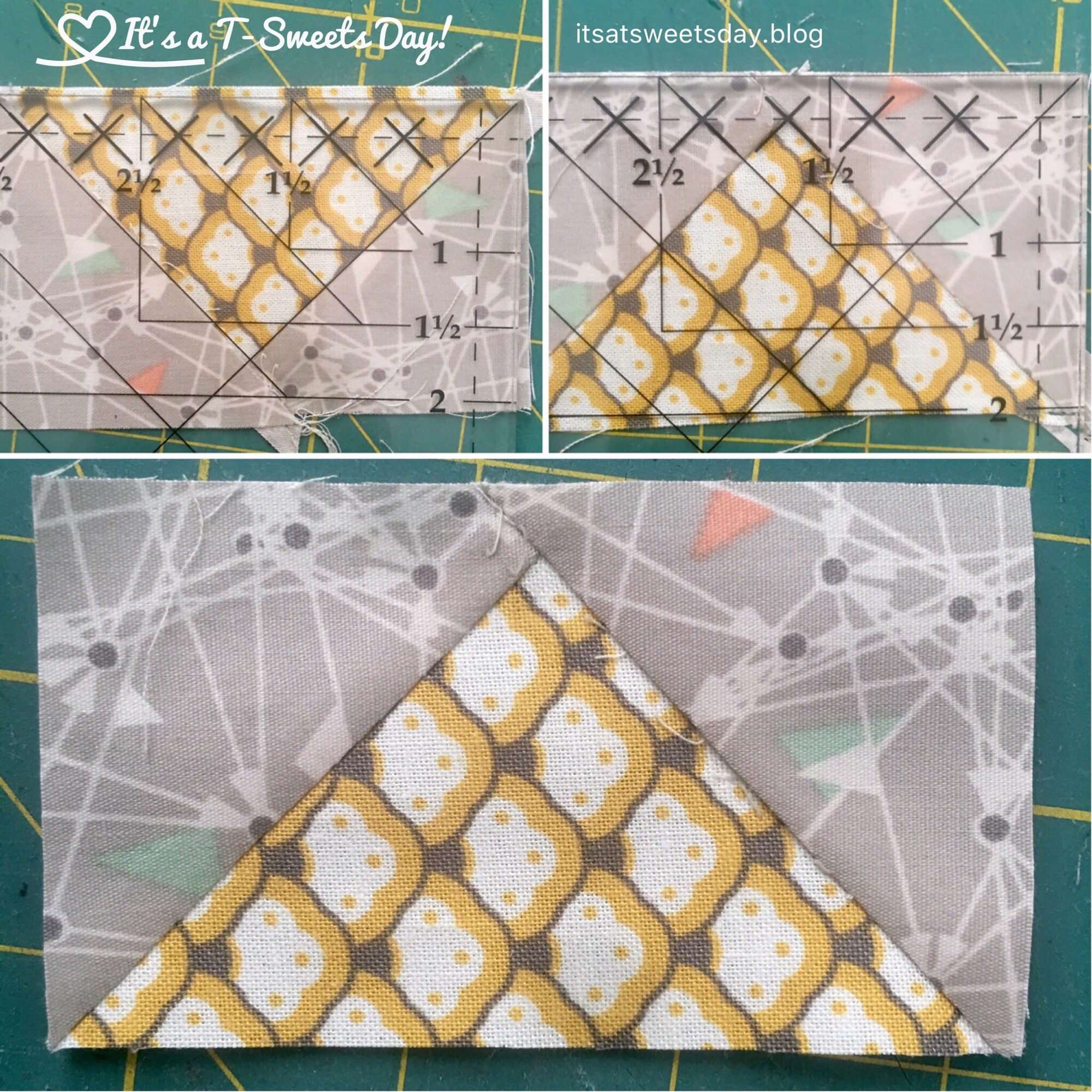 Then the handy ruler gives the trim guides.  I put the valley in the v lines of the ruler on the 3.5″ marks.  Then I turned the block over to the mountain side and lined it up and trimmed again