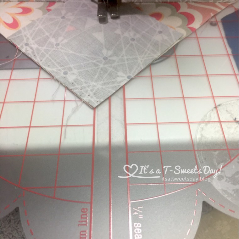 It was easy to sew the square down 1/4″ from the center on both sides using my Lori Holt seam measuring flower marker.  But it is easy and accurate to mark the lines as well.