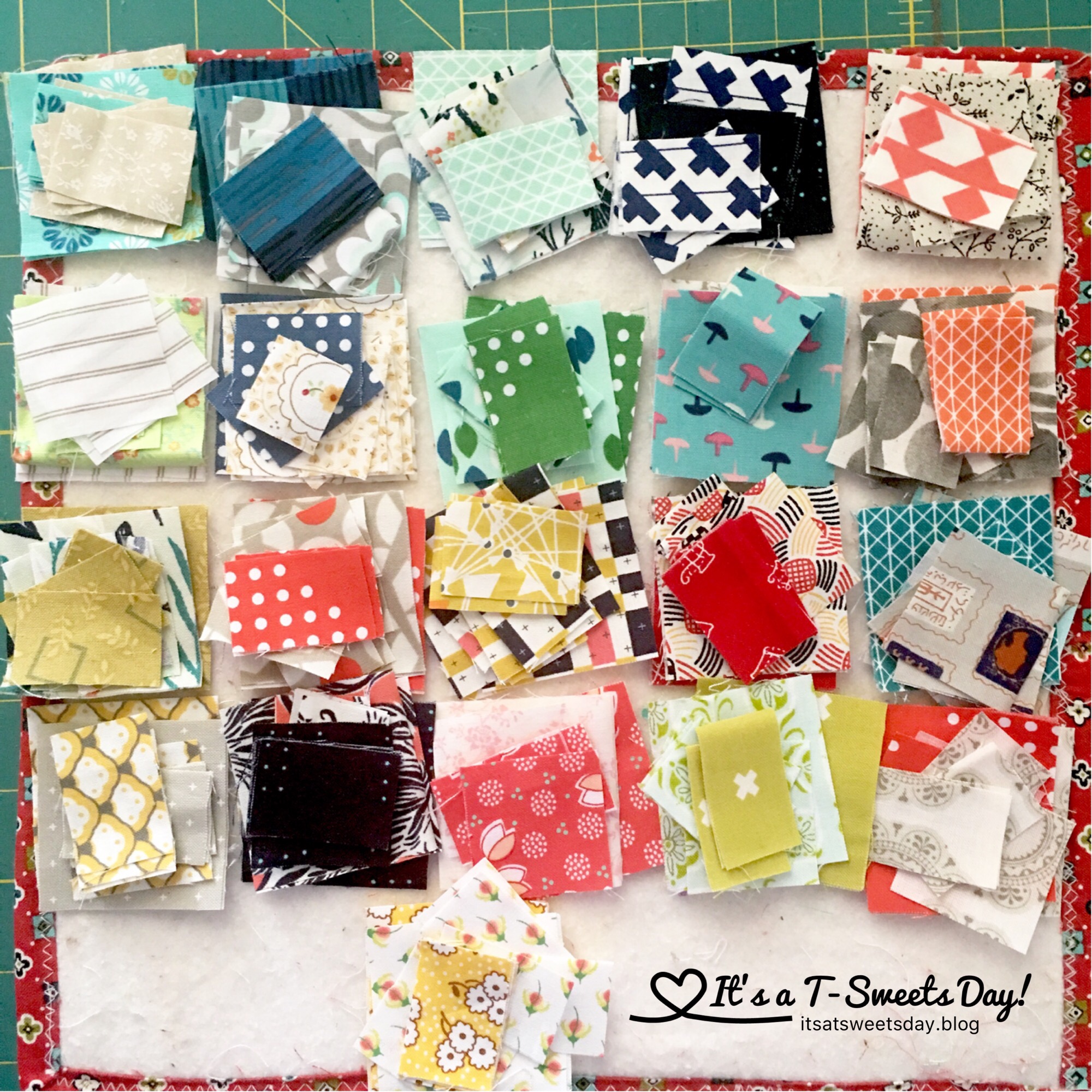The hardest part is always choosing the colors and cutting the little squares and rectangles. I like to cut mine out all at once and place them in block groups on my preview board.
