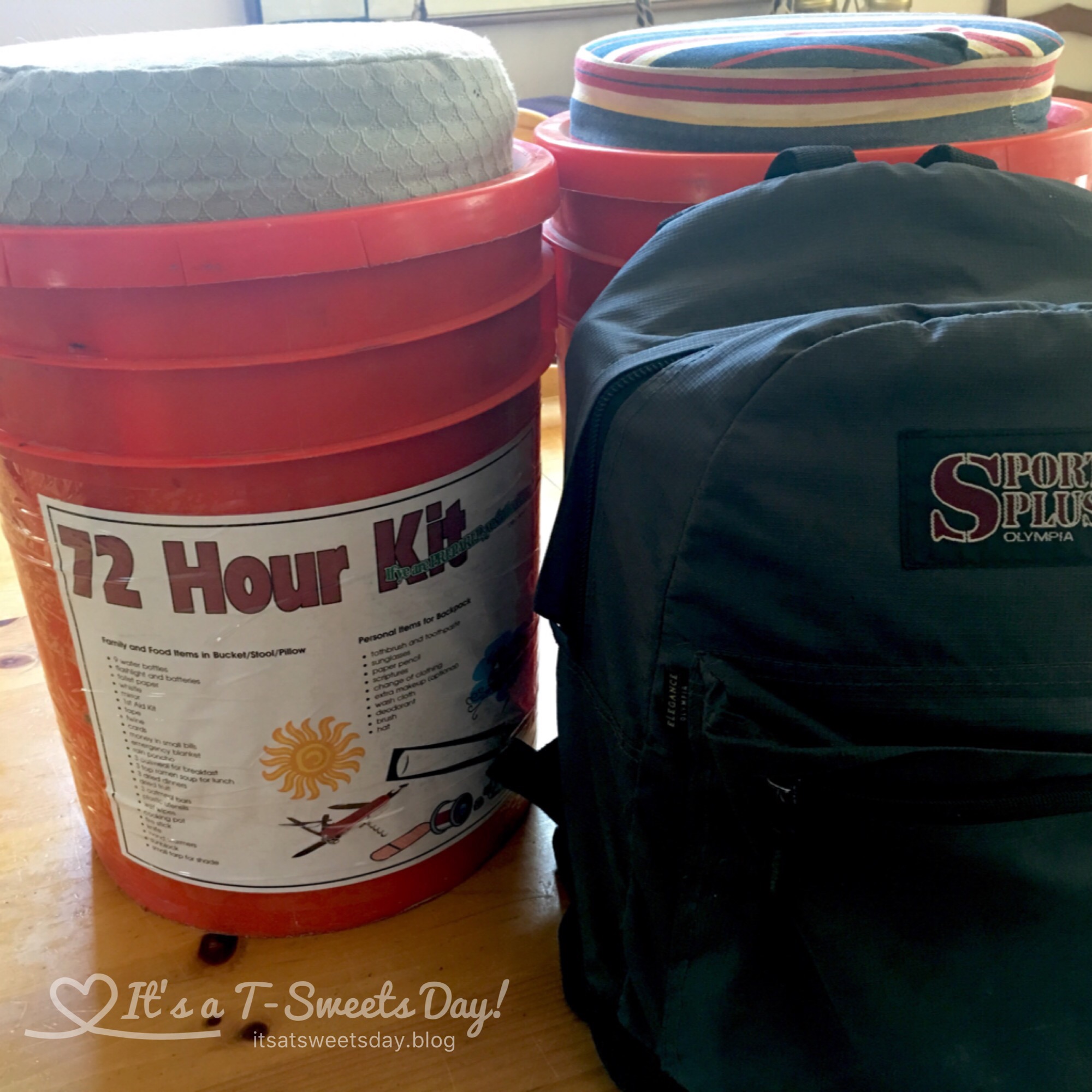 I have been working on our 72 hour kits for my hubby and I. This is a natural disaster type of kit. We can pick this backpack and these buckets up on a moment’s notice and live fairly comfortably for three days.