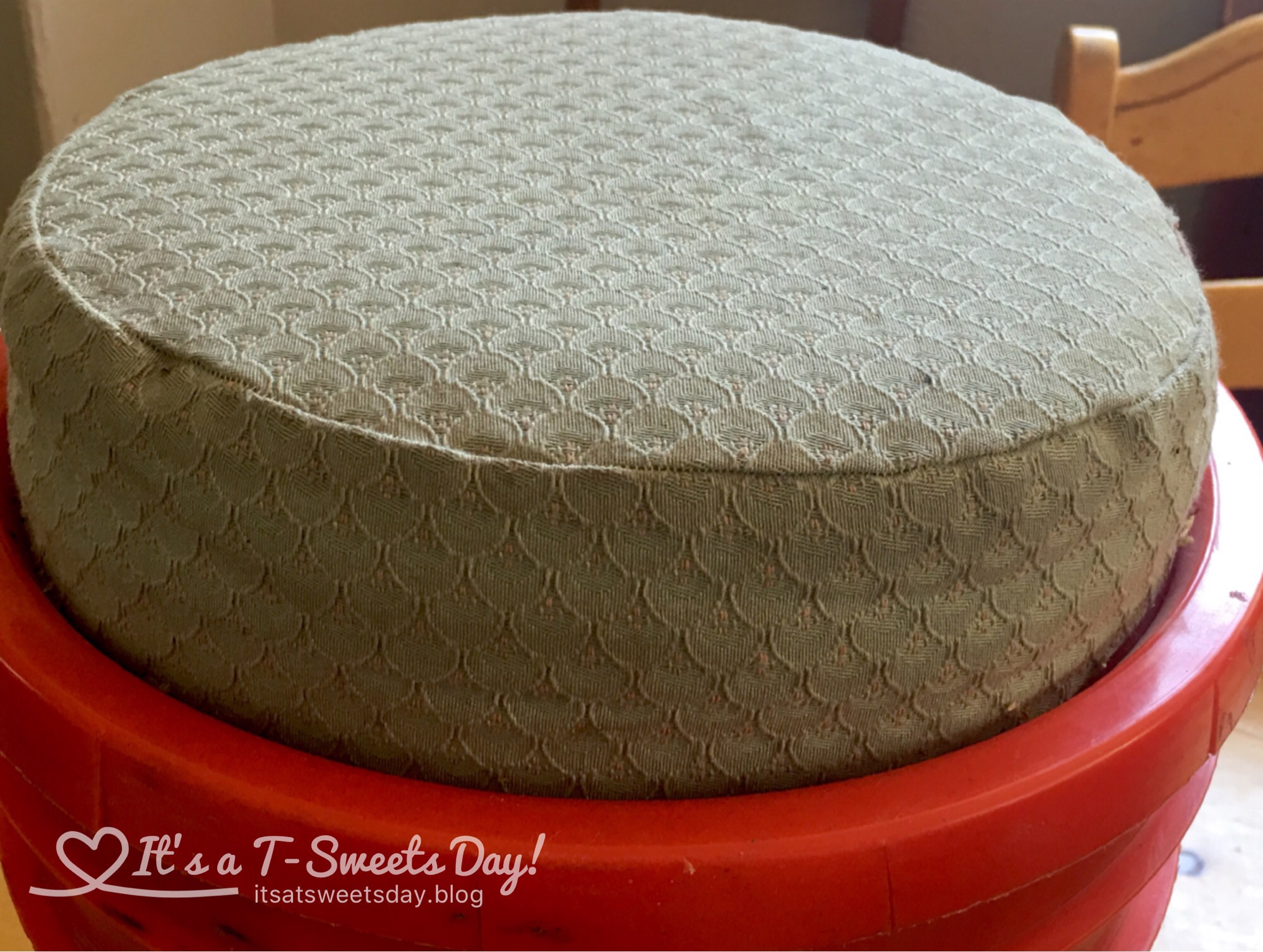 My husband cut out some wood in a circle that fit the top. I had some old foam that I made a cover for out of old upholstery fabric I had in my stash. I stapled over the wood around the bottom. My husband screwed it onto the lid. PERFECT!!