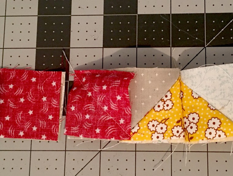 I took them all to my machine and stitch and flipped the squares down. First one square and then the other. Marking my machine sure made it easy to keep the sewing line straight:)