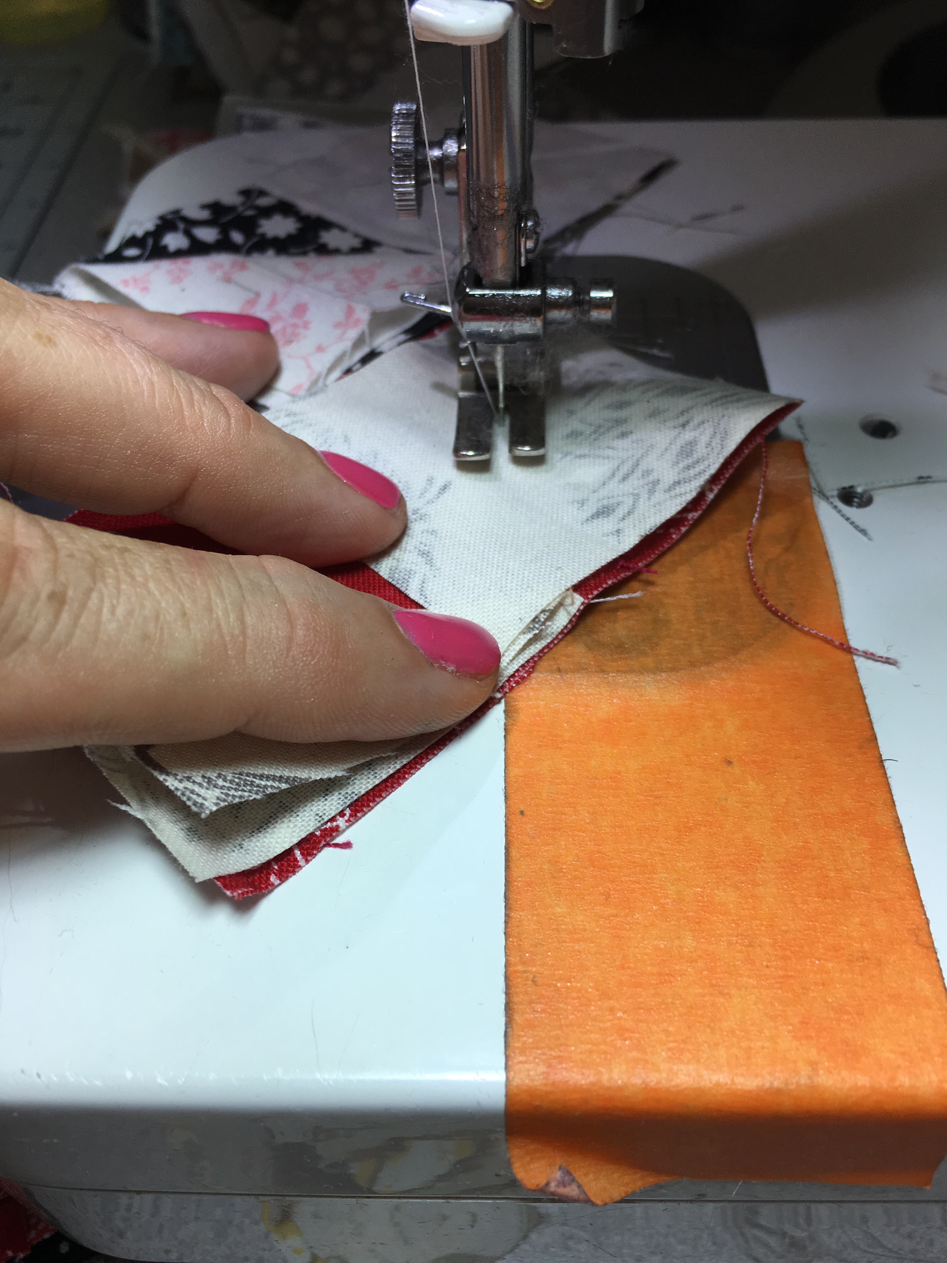 I took them all to my machine and stitch and flipped the squares down. First one square and then the other. Marking my machine sure made it easy to keep the sewing line straight:)