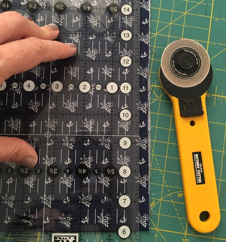 • Cut the fabric into 2″ strips.  Be sure to check that the edge and the top or bottom of the ruler are lined up neatly with the edges of the fabric.   Sometimes after cutting a few strips, the cuts can get a little bit off. Square the fabric again. And keep cutting.