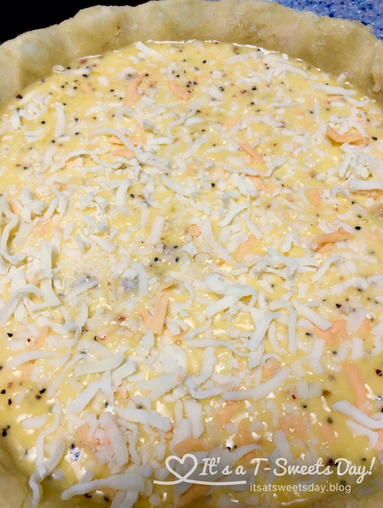 I cooked my bacon and chopped it fine.  I layered the entire shell with the bacon and then poured in my egg, cheese and milk mixture.  I had a large pan so I doubled the recipe.