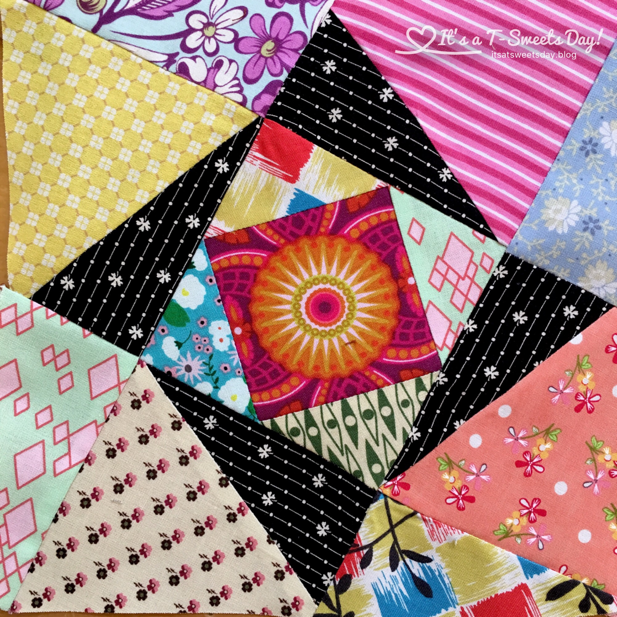 It was fun to watch the wonky squares appear as I sewed the dark triangle to the block. I think colored turbine is the right name for this one. 🙂