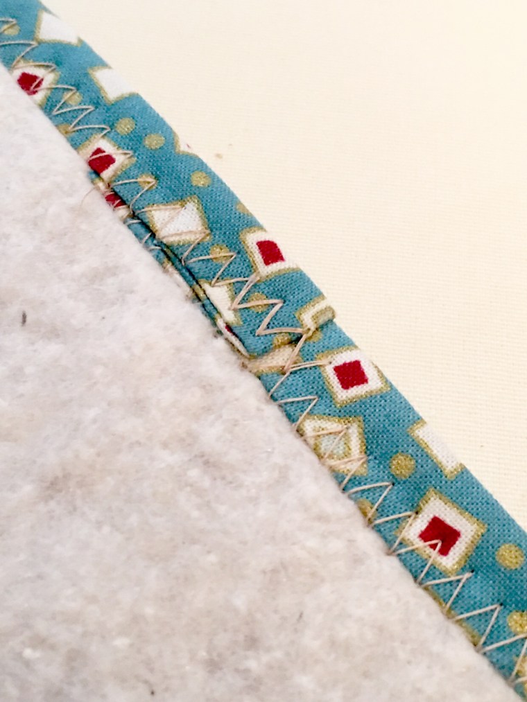 - Set your machine to a wide zig zag stitch and starting in the middle of one side, fold the fabric over the board. Stitch through the fabric and board. If the left side of your stitch is at the edge of your binding, it should easily catch the back of the binding as well.
