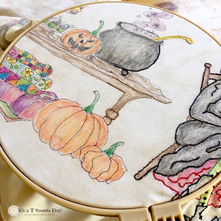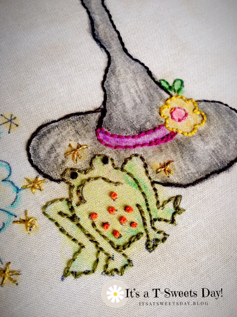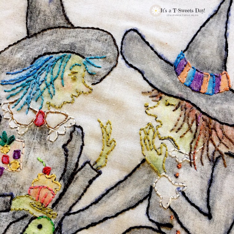 I know what those young witches are talking about…they are trying to figure out a spell or potion that will take all the calories/carbs out of the cupcakes. I think the little green guy is worried that they may need a “toe of toad” to make it work. Love your embroidery. I may look into the HQAL group. I have a small quilt that I haven’t loved enough to finish hand quilting. Maybe it’s time….Also thinking about adding some big stitch HQ to a baby quilt I recently made for another challenge. Freckledfoxquiltery@gmail.com