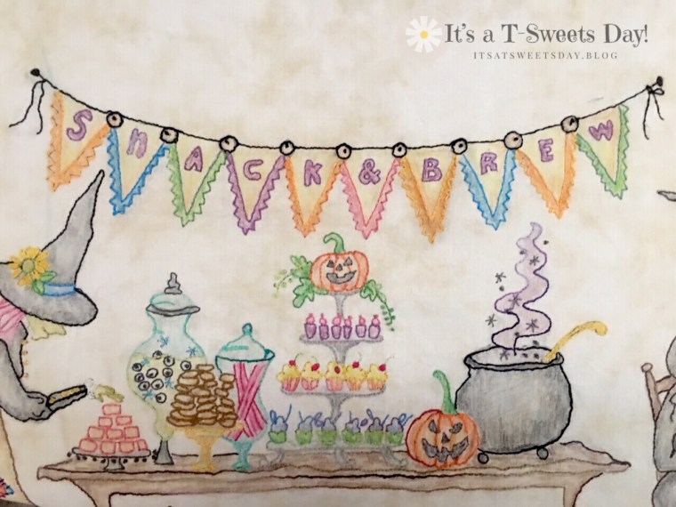 The food table is ready, the witches have arrived, and the party can begin! I am so happy to report that with this Hand Quilt Along Report, I am now finished with my second witch party panel. Yea!