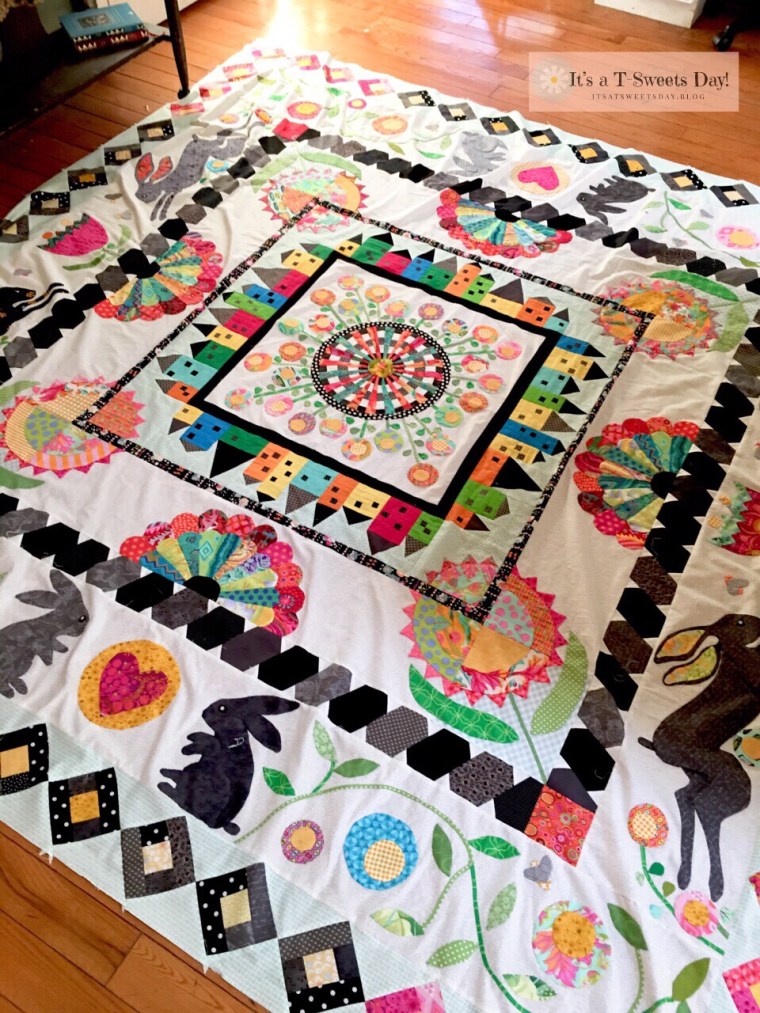I can’t believe it! I am finished piecing my Down the Rabbit Hole Quilt! I am so excited, can you tell?:). The last time I posted about this I had started the appliqué rabbit border.