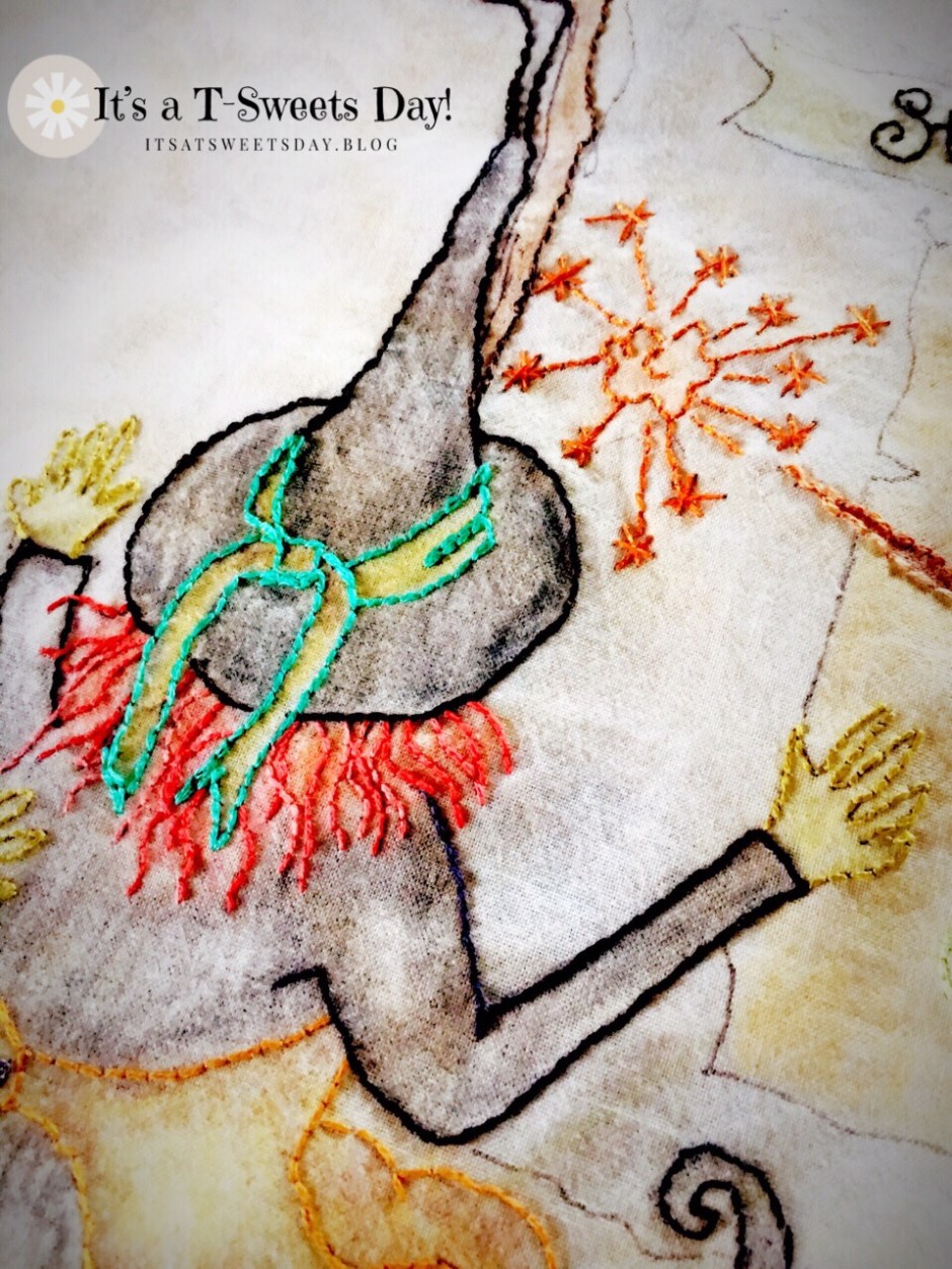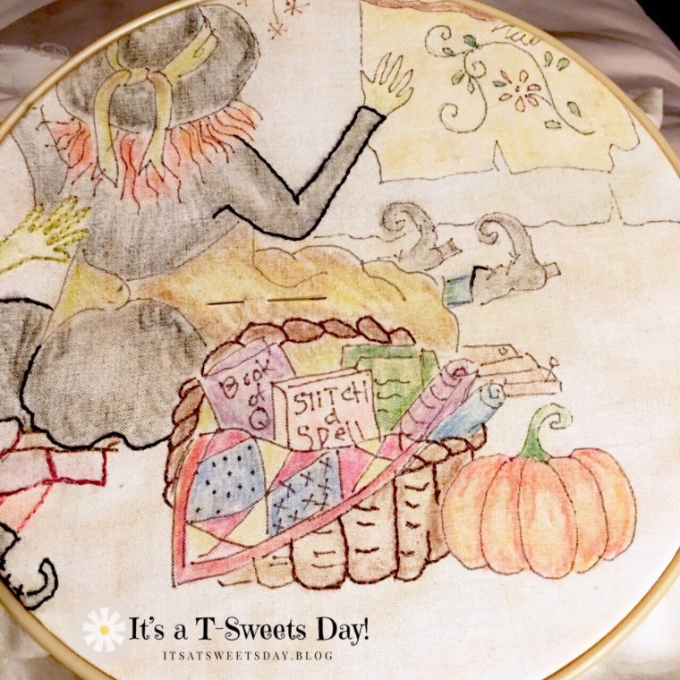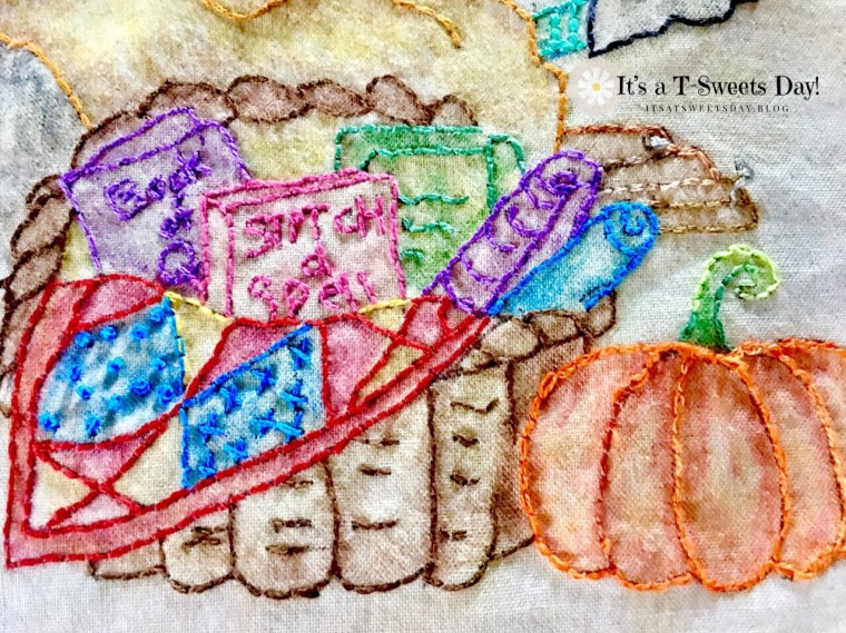 I can’t believe it, but I really am almost done with this last panel for my Crab Apple Hill Studios Salem Quilt Guild! Last time I posted about this, I had three witches and many baskets to stitch up.