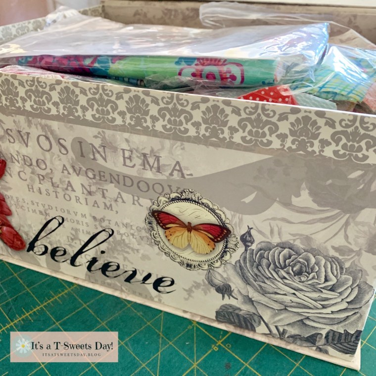 I only have one more set of blocks, and the pinwheels left. I can do this! I keep the blocks and supplies in a box with “Believe” written on it. How fitting, right?:)