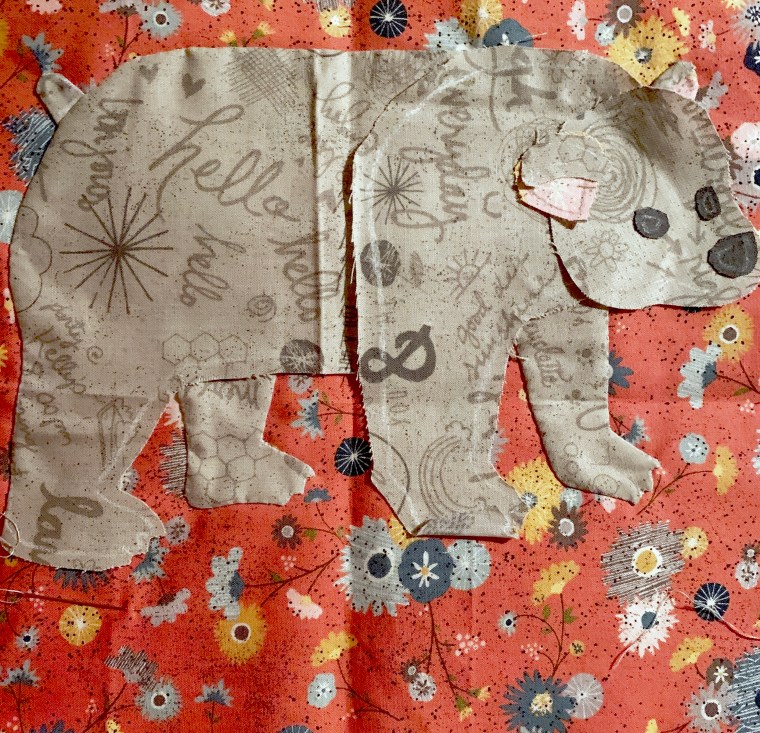 Mr. Bear is cut out, glued down and waiting for stitching.