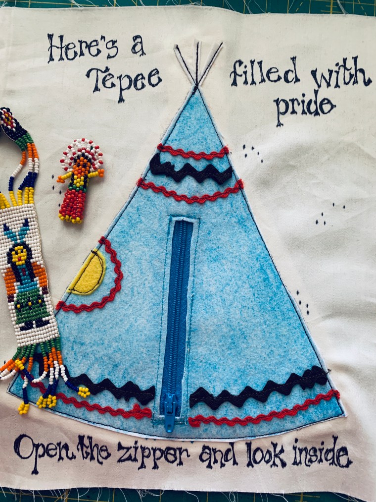 Next- The Teepee used a left over zipper, some old scraps of pellon that I colored and ironed to set, and some extra zigzag tape. When I say extra, this tape was probably from the 1970’s!