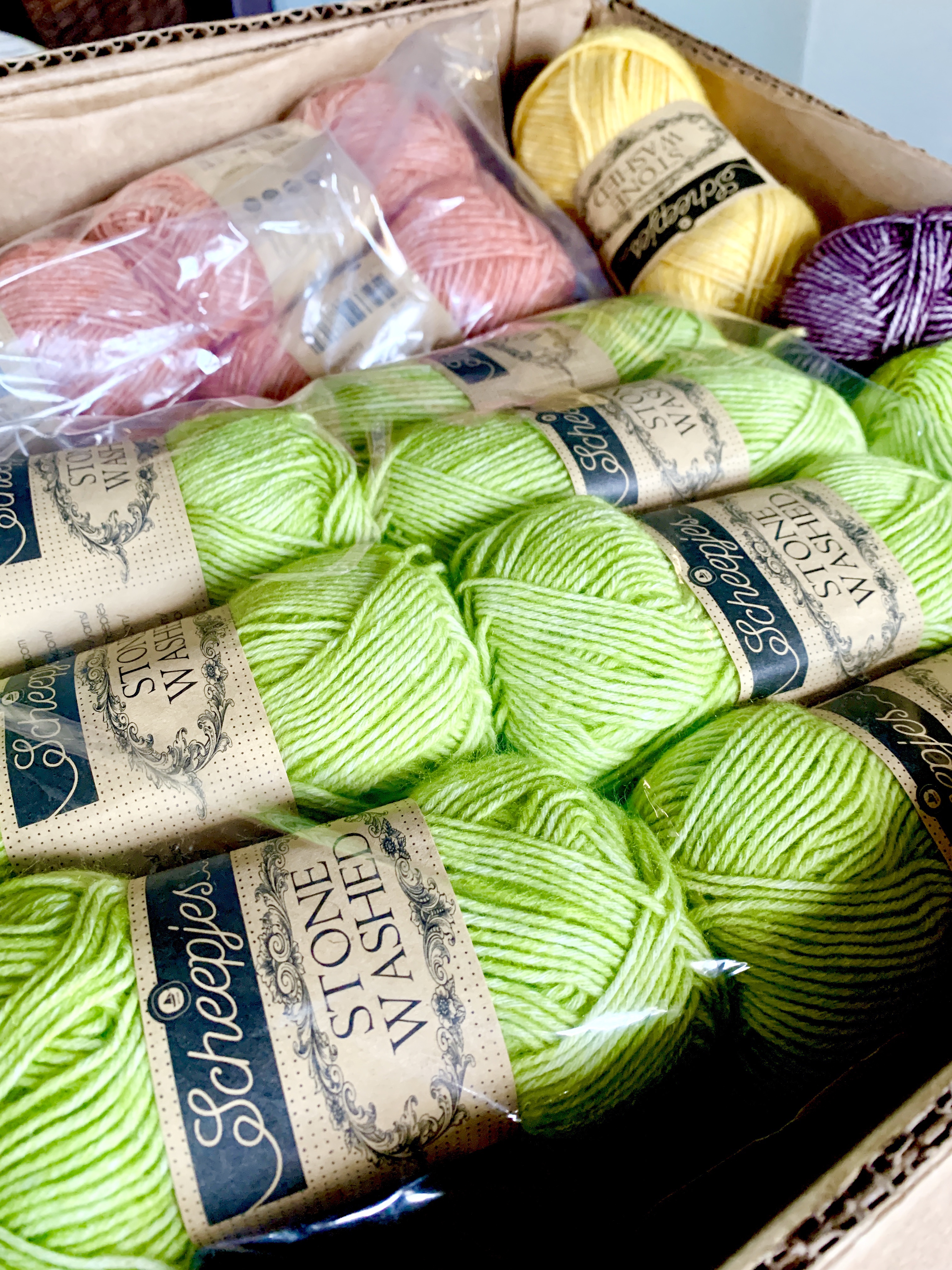 Just look at this lovely box of crochet candy! This is Scheepjes stone washed yarn and is a very soft cotton type yarn. It is a rather thin yarn and is stitched with a small 3mm needle. I have used Scheepjes before, and I love the quality and I love the price.
