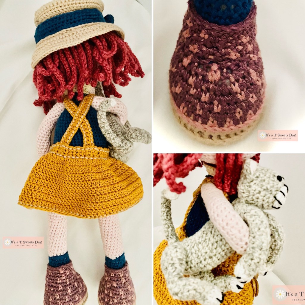 I really appreciated the attention to detail in the pattern. The skirt with the stitching and the cross back, the individually stitched contrasting colored shoes, and the tail and legs of Mr. Cat show the love and effort from the stitcher. Love, love, love!!
