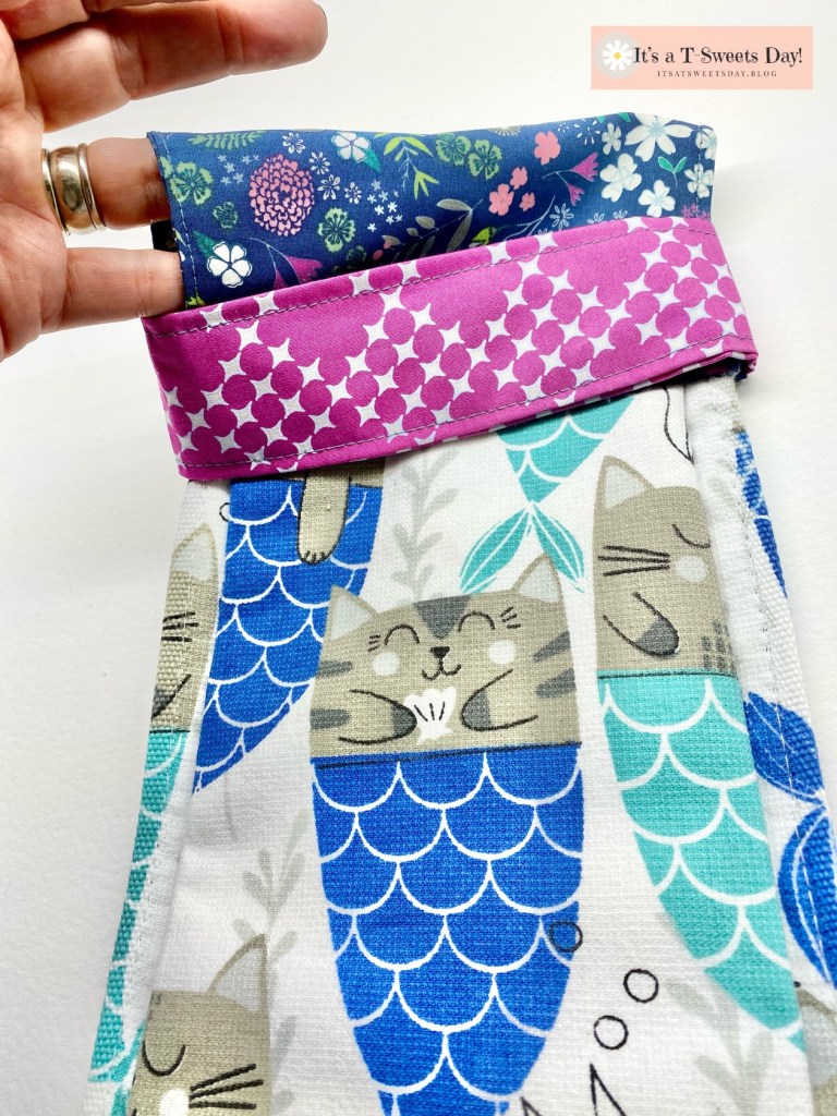 And what would potholders be without a matching towel? I fell in love with this free pattern on YouTube by Notches Sewing because of the lack of buttons or Velcro. It just folds on top of itself to hang over a handle. I like how streamlined it looks.