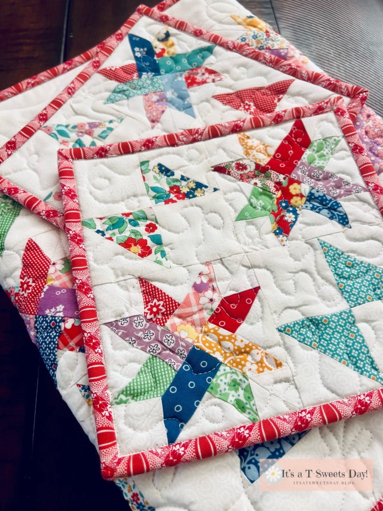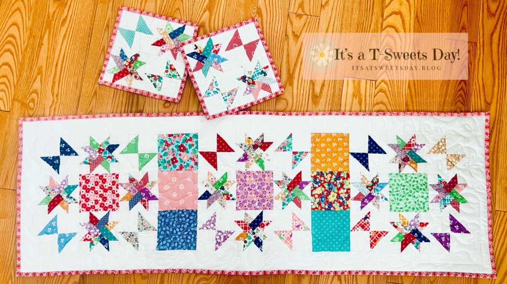 The pattern called for four of the blocks to be joined together for a long table runner, but I opted to make the runner on three blocks long so I could have two potholders to match instead. I can just see a happy get together with these pretty potholders and warming runner greeting the guests!