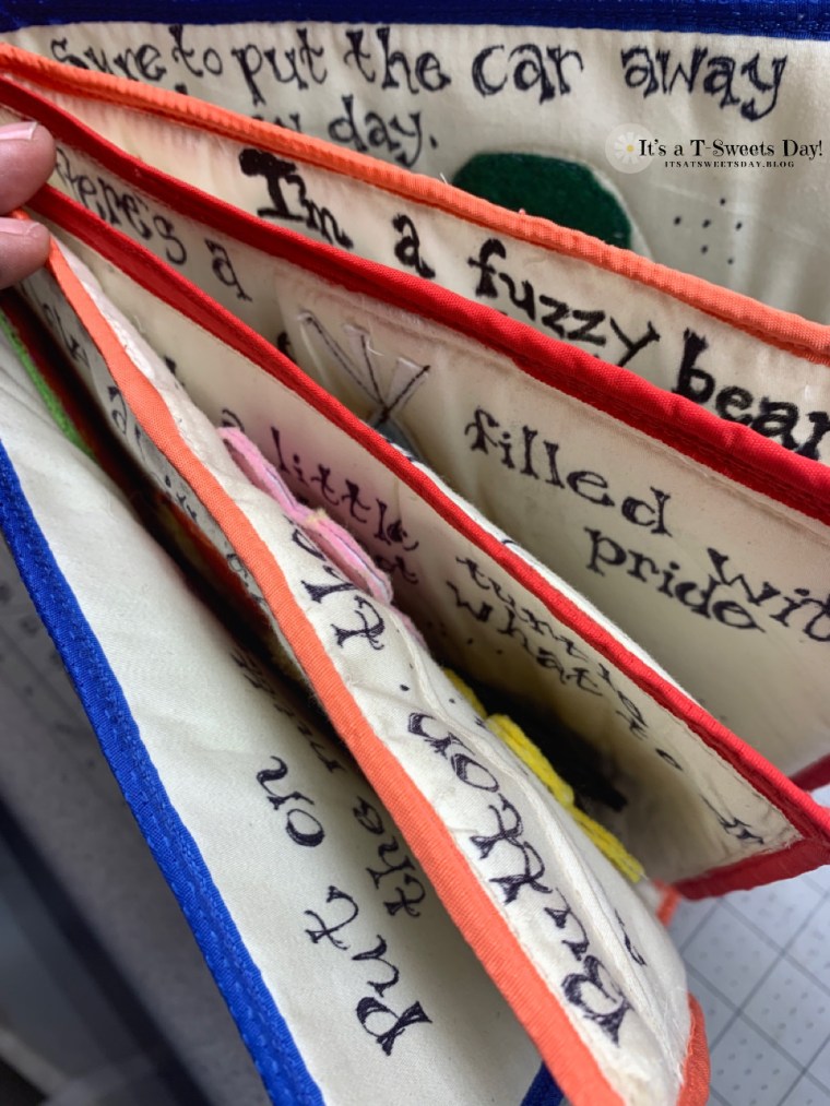 I have had so much fun making every page of this truly creative book. I enjoyed saying ROAR as I sewed the Lion page with his braided tail. And who doesn’t like a polka dot pocket stuffed with a hankie?