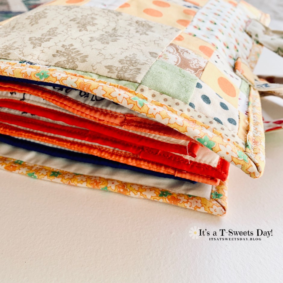 I used two orphaned 12.5″ quilt blocks from my tone it down quilt for the cover. I absolutely LOVE how it turned out!