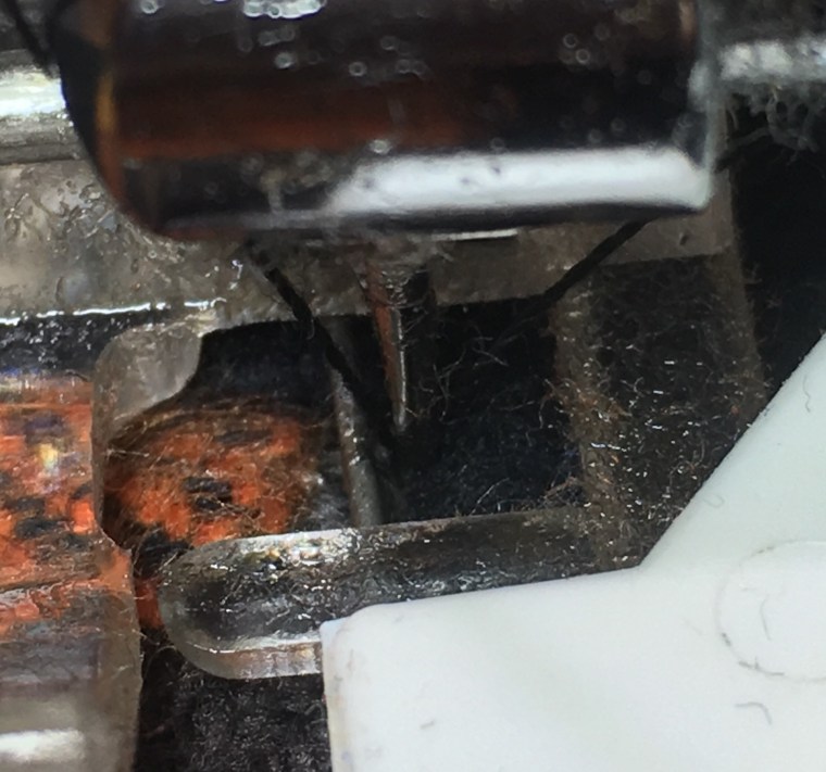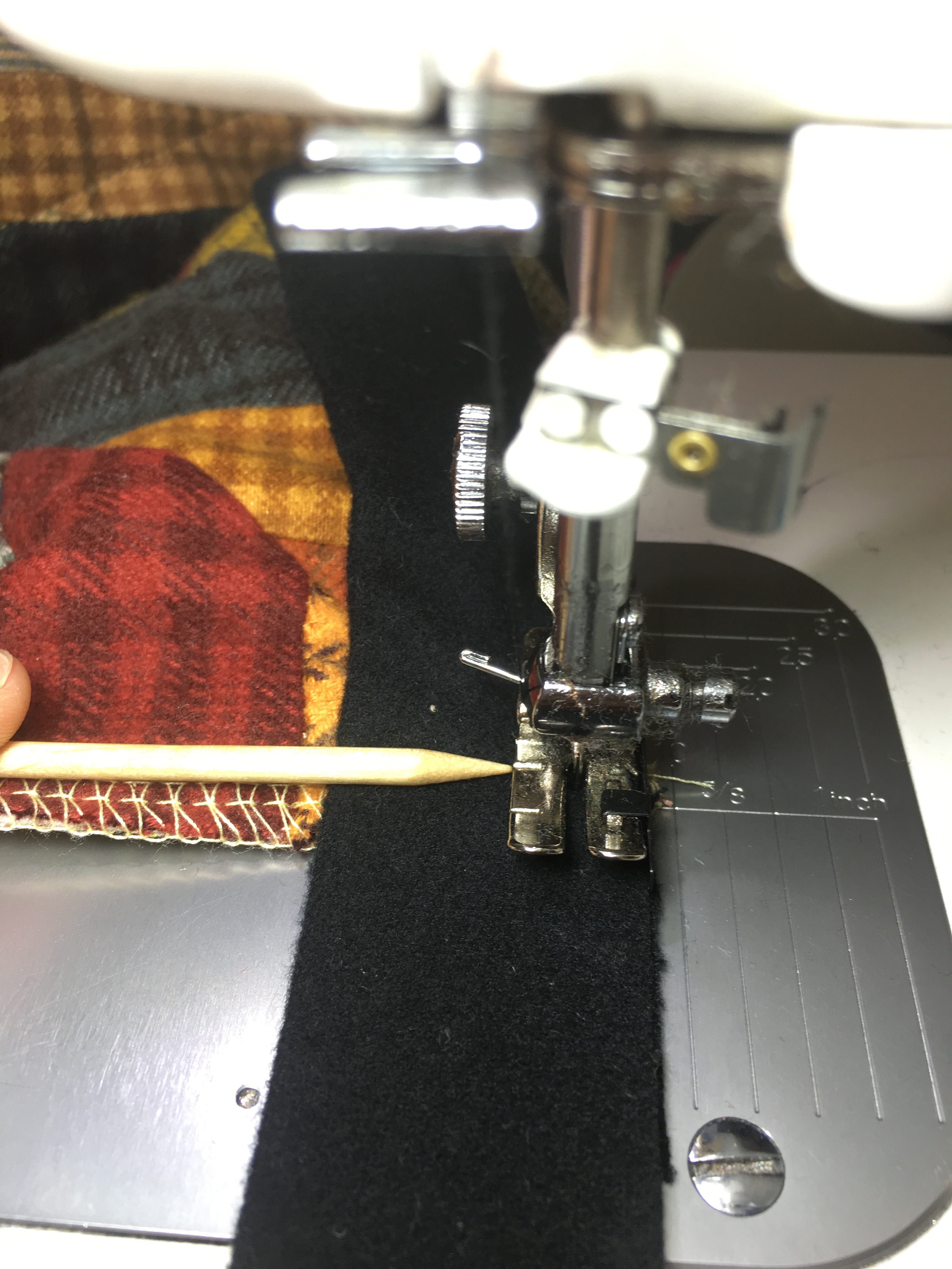 - Use your fingers to feel that the backing is folding nicely over the back stitching and every so often look on the back to check the accuracy of the fold. This is especially important at the beginning. If it isn’t catching the back, adjust your needle or the plate to the needle with the screw.