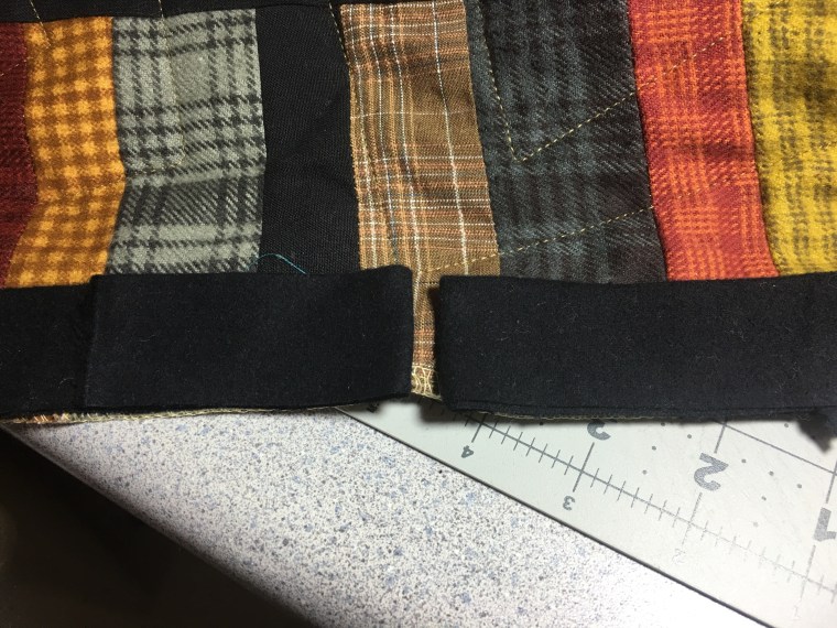 - Turn the quilt over, fold the binding down making sure to be covering the stitching and press AGAIN.