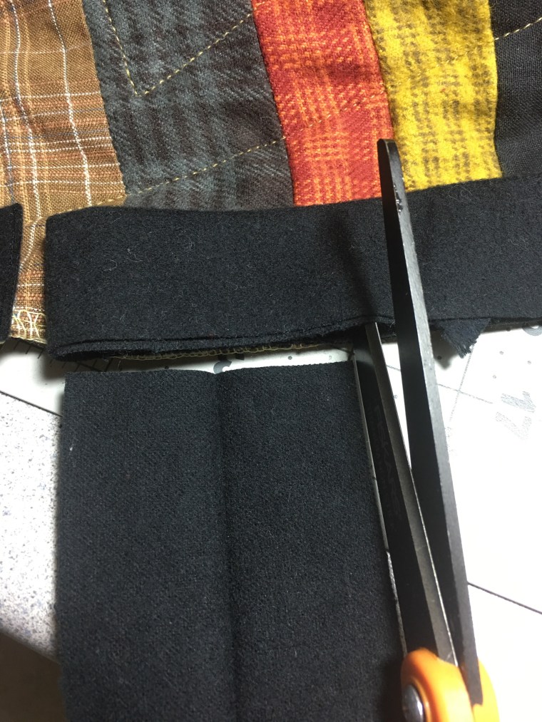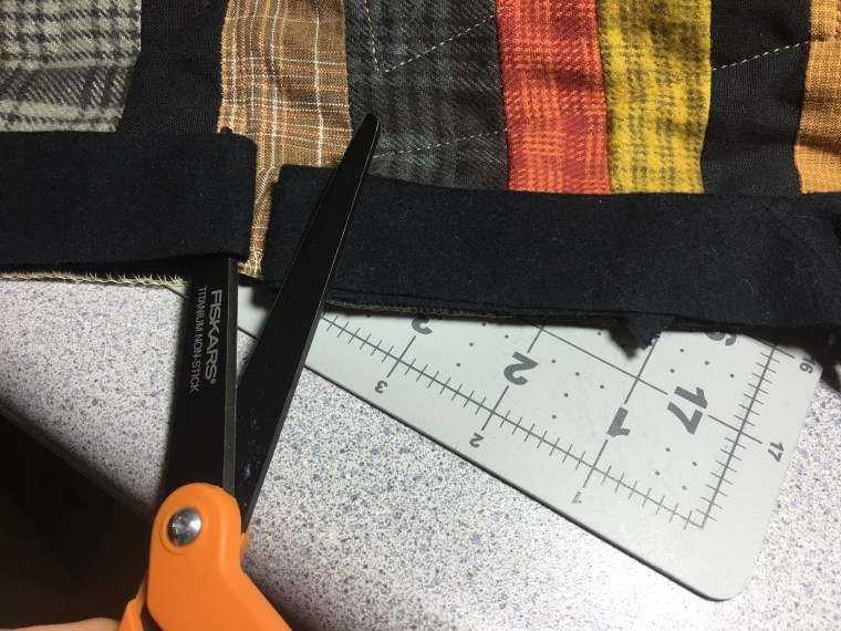 - Open the cut piece and measure the right side binding with it. Cut the top two layers of the right side binding to that measurement.