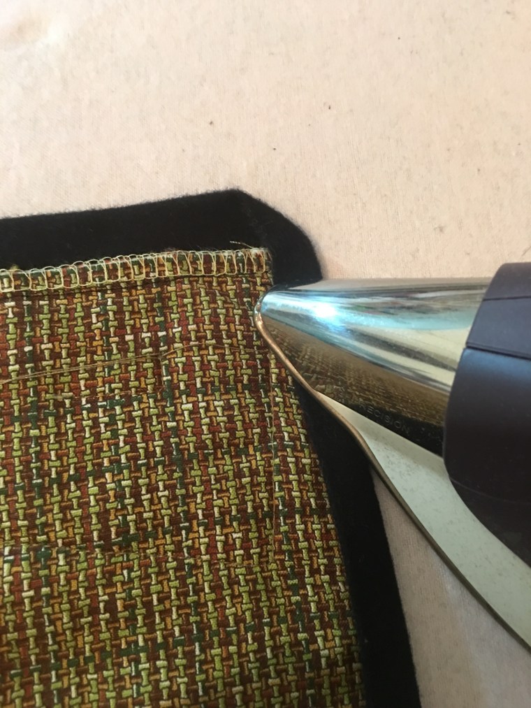 - When you get to the corner, take care to make the angles opposite on the back from the front. I sometimes use a dot of glue under the folded fabric and then give it a press to hold it together.