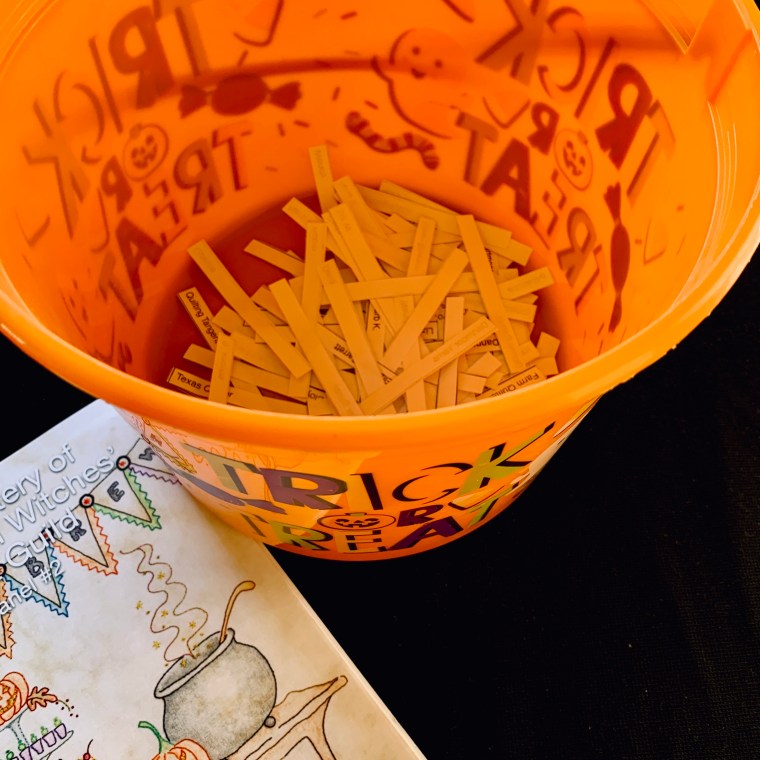 I am happy to say that there were over 100 entries for this prize. I printed each one out and put them in my one and only Halloween trick or treat bucket. I’m surprised I even had that one- lol:)