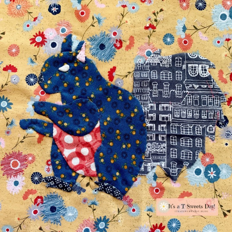 The eye disappeared with black and the white looks a little creepy. I may go back and add a bit of black, but then he may look like a cartoon character…. I think there is so much going on in this quilt that that little white eye will probably not show up at all! I am going to wait and see:)