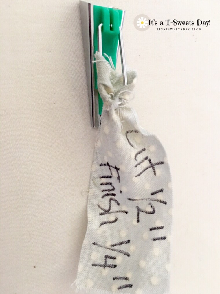 On the back of the fabric I write the size of strip I need to cut and the finished size it will make. Then I cut a small slit in one end and thread the other end through the slit around the pull. PERFECT!
