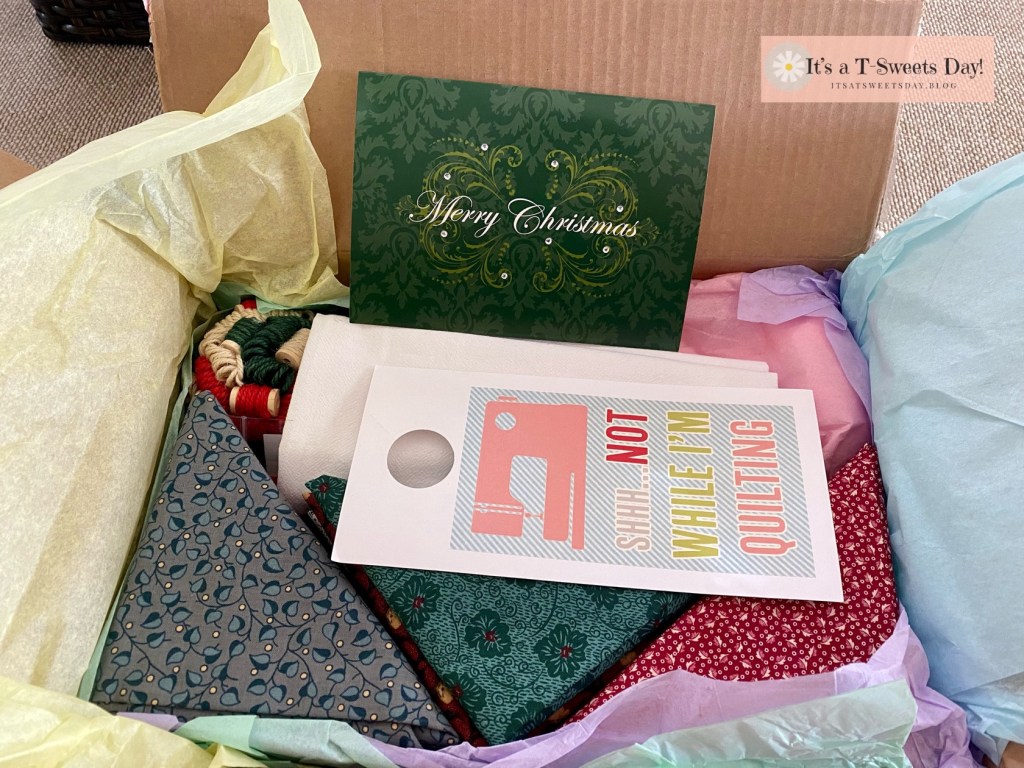 I just love all of the thoughtful gifts all laid out in their beauty. It was filled with fabric, sewing gadgets, Christmas ornaments, funny little sewing laughs, and some Wyoming huckleberry chocolate!