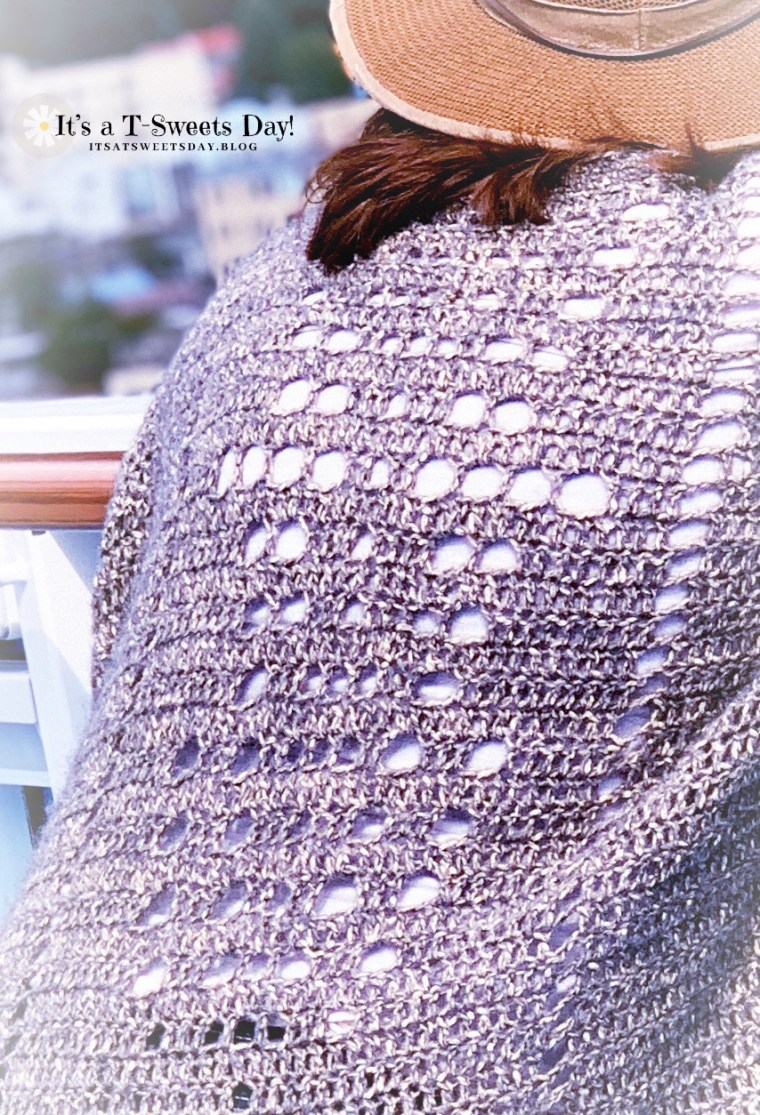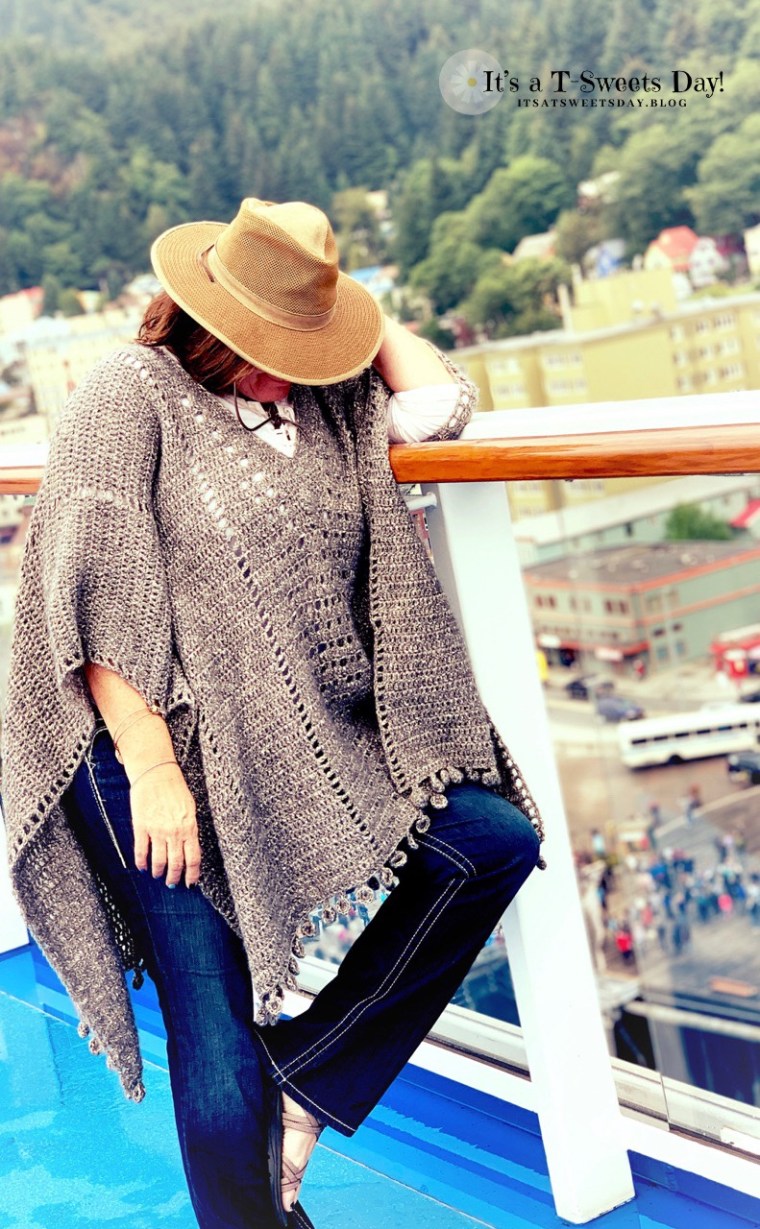 I am finished, and just in time! I was able to take my completed poncho on my Alaskan cruise to enjoy in the cool weather. It was the perfect place for its “maiden voyage”.