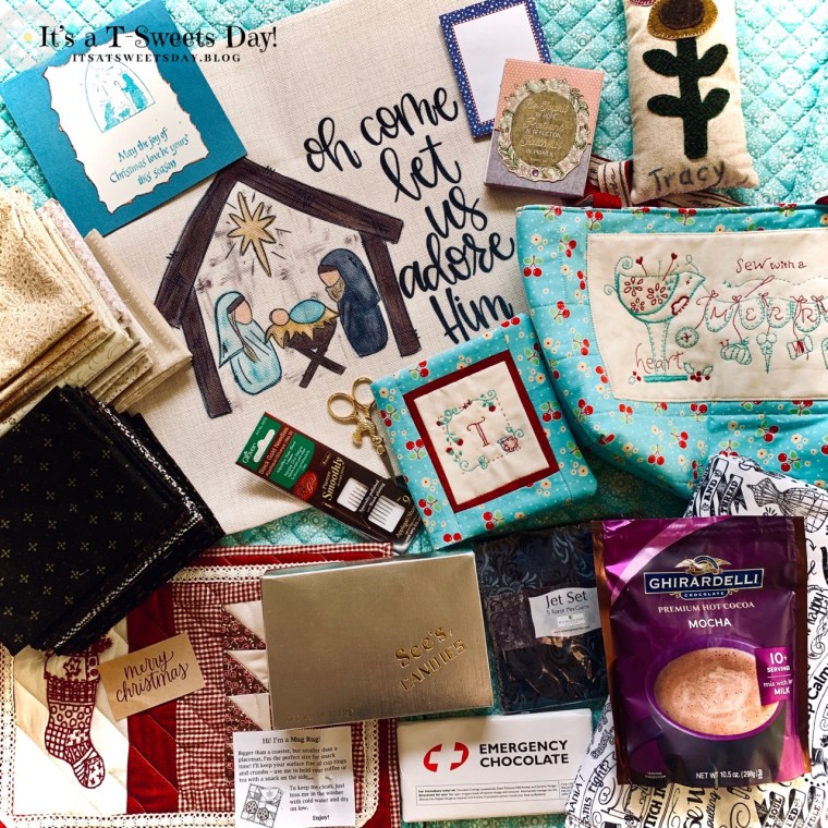 There are 24 fat quarters in shades of black and cream, a beautiful nativity pillow cover that her friend made, notepads and chocolate. By my favorite things are the hand stitched items.
