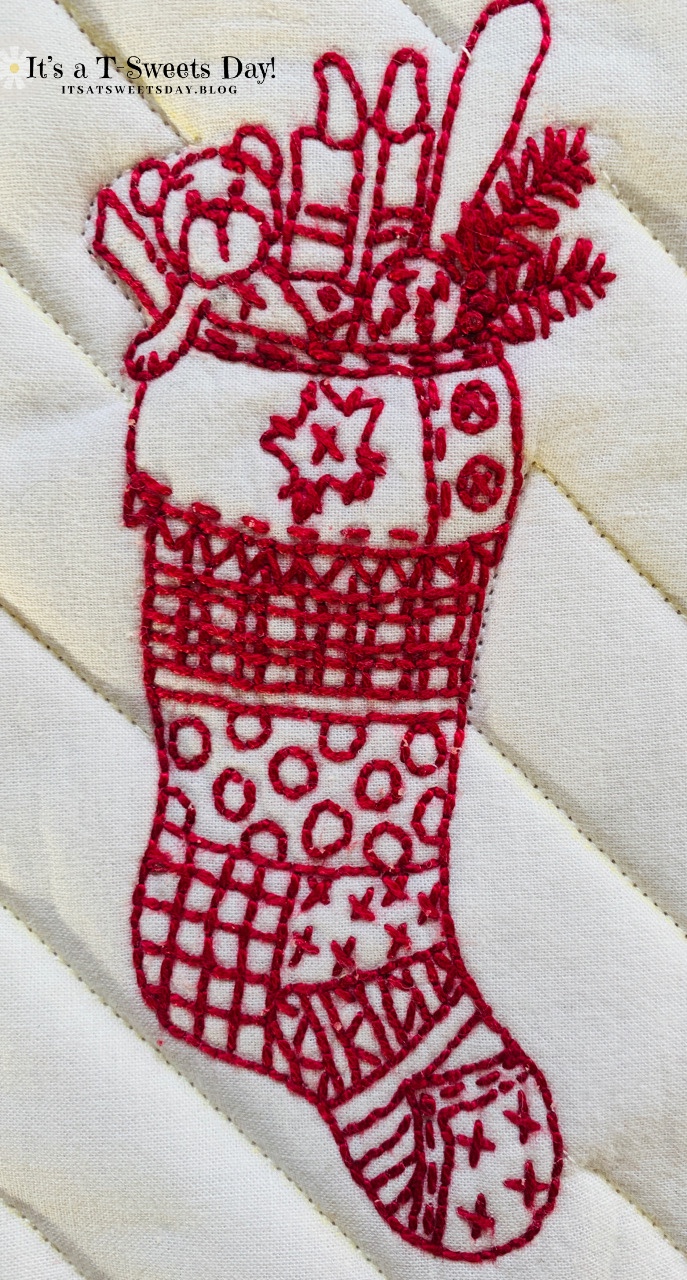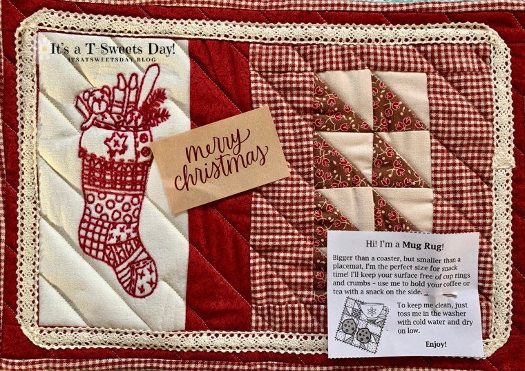 She stitched this beautiful mug rug for sipping cocoa and enjoying a snack in the morning while I sew. Isn’t it the cutest thing?:)