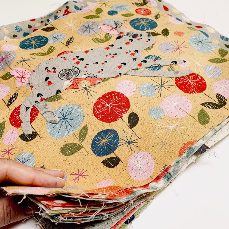 Whew! This is a lot of work! Just when I think I am surely at the end, I go back to my pattern and realize that I still have quite a bit to go. I still have two more animal border blocks and 12 more wreath blocks. — Yep, I still have a ways to go.